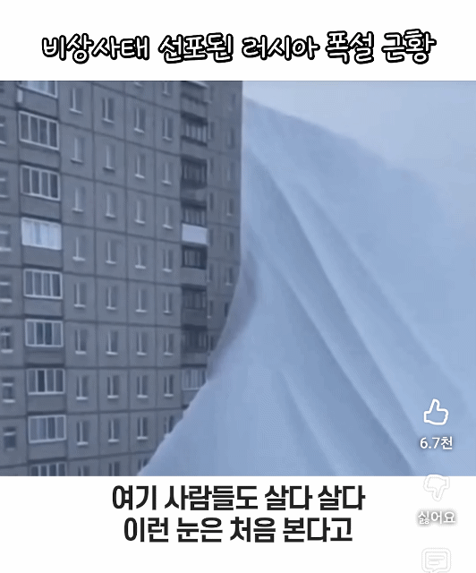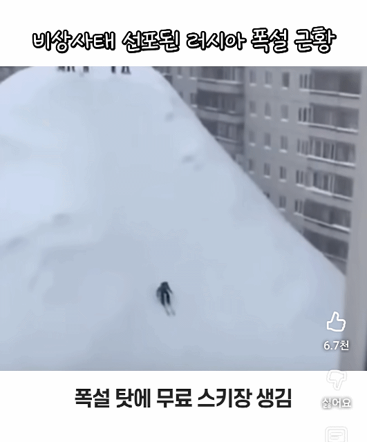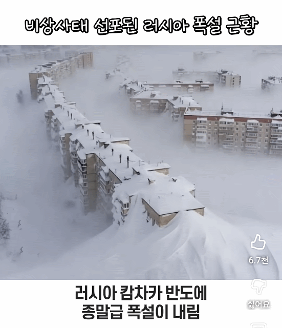[기타]비상사태 선포된 러시아 폭설 근황 작성자깜짜링|작성시간26.01.20|조회수89,872 목록 댓글 47 글자크기 작게가 글자크기 크게가 출처: https://youtube.com/shorts/Wv9XpLSsHY8?si=3ZVZdLX2nRrF3YFU13일부터 쭉 눈이 내렸는데24시간동안 한달 강수량 60퍼가 내리기도햇다고..와.. 다음검색 현재 게시글 추가 기능 열기 북마크 공유하기 신고 센터로 신고 댓글 댓글 47 댓글쓰기 답글쓰기 댓글 리스트 작성자출근을 그만두는 법 | 작성시간 26.01.20 투모로우잖아... 작성자@Rihanna | 작성시간 26.01.20 일부는 에이아이같음.. 저렇게 예쁘게 슬로프처럼 쌓일리가 없음 ..ㅋㅋ 작성자강수혜 | 작성시간 26.01.20 내? 작성자은밀한 김밥까페 | 작성시간 26.01.20 진짜 살다살다 처음보긴한다;;;; 작성자바디프렌드 | 작성시간 26.01.21 건물 위는 계속 제설을 한건가?? 어떻게 건물 위엔 안쌓인거지?? 댓글 전체보기