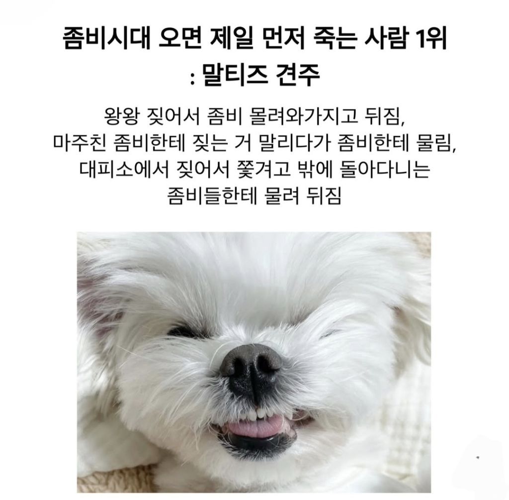 작성자고양이는눈빛만마주쳐도노화방지 작성시간 26.01.20 견주는 말티즈 입 막으려고 주댕이 잡는순간 말티한테 손 물리면서 좀비한테 뒤짐 ㅠ