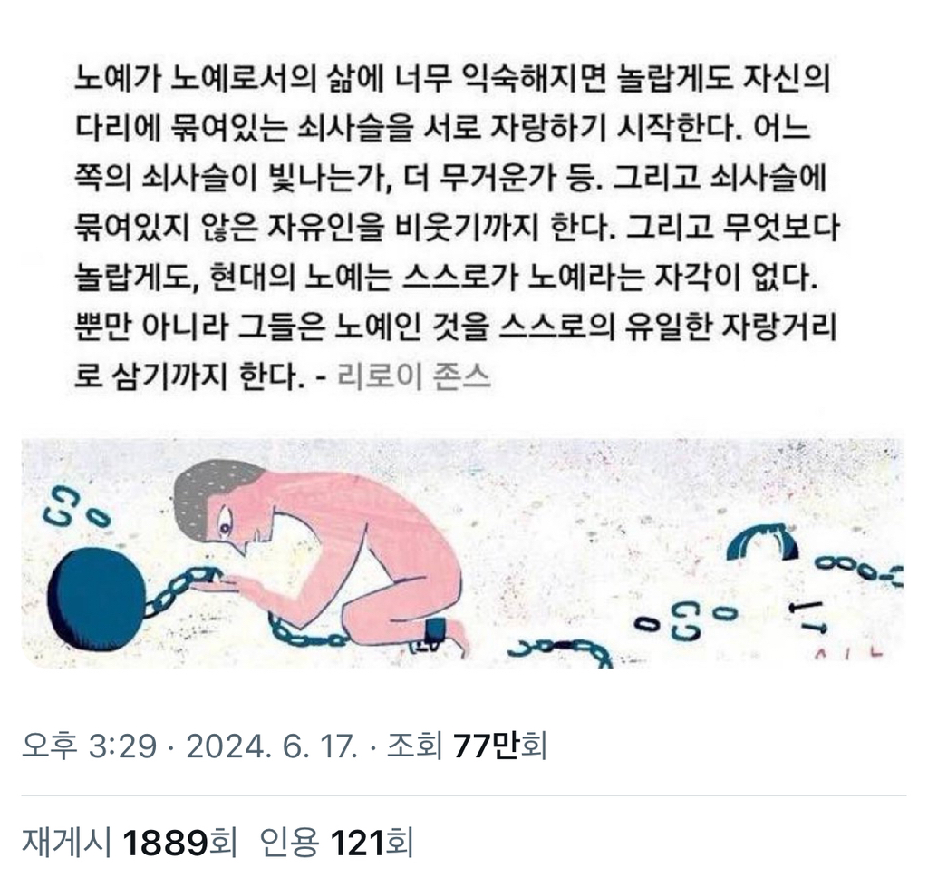 [스크랩] [흥미돋]이거 진짜 맞말이네 작성자이프로감자아|작성시간26.01.20|조회수23,983 목록 댓글 17 글자크기 작게가 글자크기 크게가 다음검색 스크랩 원문 : *여성시대* 차분한 20대들의 알흠다운 공간 현재 게시글 추가 기능 열기 북마크 공유하기 신고 센터로 신고 댓글 댓글 17 댓글쓰기 답글쓰기 댓글 리스트 답댓글 작성자지붕이우주에 | 작성시간 26.01.20 33 답댓글 작성자여신이축복한다 | 작성시간 26.01.20 55 완전 답댓글 작성자고양이토끼갱얼쥐 | 작성시간 26.01.20 66 작성자콬훗ㅁ헝 | 작성시간 26.01.20 먹고 살아야되는데 어쩌노 직장인=노예 이게 공식은 아닌데 ㅋㅋㅋㅋㅋㅋㅋㅋ 회사 다니면서 자존감 자부심 활력 올라가는 사람도 많아요..(일단 난 아니지만) 작성자Stardust | 작성시간 26.01.21 ㅇㄱㄹㅇ 댓글 전체보기