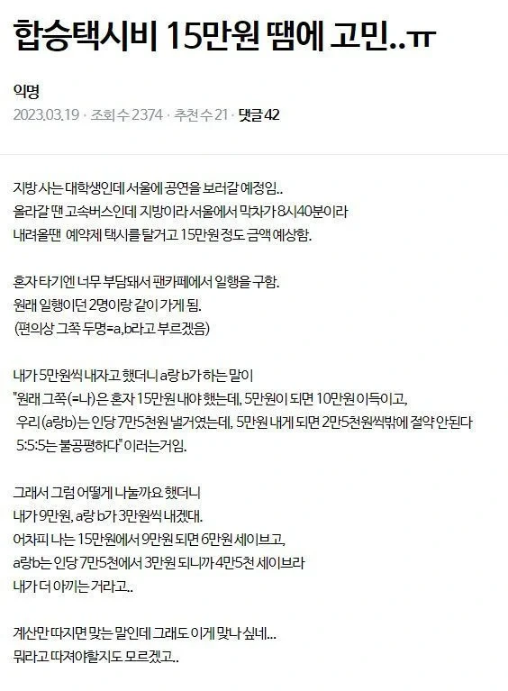 [흥미돋]합승택시비 15만원 땜에 고민 작성자Sunmoonstar02|작성시간26.01.20|조회수44,411 목록 댓글 210 글자크기 작게가 글자크기 크게가 출처: https://theqoo.net/square/4067530880더쿠 - 합승택시비 15만원 땜에 고민여기를 눌러 링크를 확인하세요theqoo.net 다음검색 현재 게시글 추가 기능 열기 북마크 공유하기 신고 센터로 신고 댓글 댓글 210 댓글쓰기 답글쓰기 댓글 리스트 작성자정지안 | 작성시간 26.01.21 걍 혼자 15 쓸란다 작성자헤헤헤ㅔ 배고프다 | 작성시간 26.01.21 ㅋㅋ... 작성자조리퐁리 | 작성시간 26.01.21 뭔 개소리야 작성자내일우리가 | 작성시간 26.01.21 7만5천원 낼거였다 라는 전제가 어디서나온거야...? 왜 지가뭔데..? 작성자욜심히살아가 | 작성시간 26.01.21 저런 인간들이랑은 가주는게 아니다 댓글 전체보기