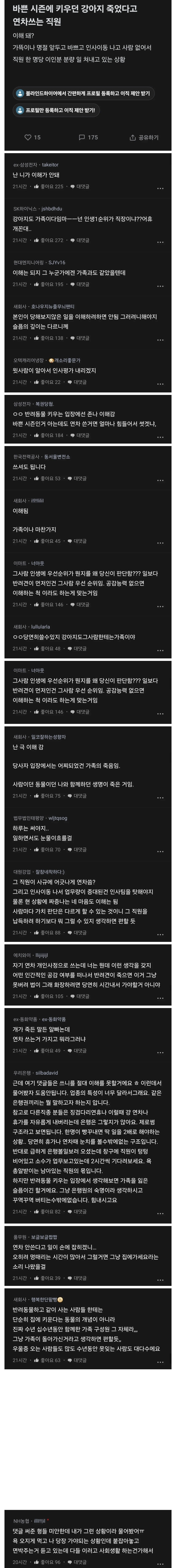 작성자쩰깅 작성시간 26.01.21 어차피 강제로 나오라 해봤자 슬퍼서 계속 눈물 죽죽 나고 일에 집중도 못할텐데 내가 상사면 마음 추스르고 오라고 먼저 연차 쓰라고 할 듯