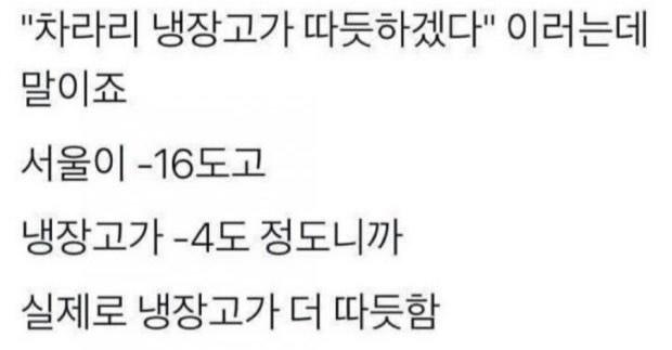 [흥미돋]이제 또 곧 하게 될 착각 작성자여단오여|작성시간26.01.20|조회수49,227 목록 댓글 5 글자크기 작게가 글자크기 크게가 출처: 여성시대 여단오여 냉장실은 영상이라 더 따뜻함그리고 영상 5도 정도 되면 날씨 풀렸다고 하겠지 다음검색 현재 게시글 추가 기능 열기 북마크 공유하기 신고 센터로 신고 댓글 댓글 5 댓글쓰기 답글쓰기 댓글 리스트 작성자카이지 | 작성시간 26.01.20 냉동실(영하20도)이랑 비교해도 냉동실은 바람 안 불어서 더 따뜻할수도 ㅌㅋㅋㅋ 작성자저는 두바이인간입니다 | 작성시간 26.01.20 냉장고 2도라서 지금 들어가면 더울듯 작성자뭐뭐뭐뭐라고 | 작성시간 26.01.20 냉장고는 바람도 안불어 작성자씻는건왜귀찮을까 | 작성시간 26.01.21 ㅠㅠ 작성자답답얌전 | 작성시간 26.01.21 사람을 냉장고에 넣는법 알려줘 댓글 전체보기