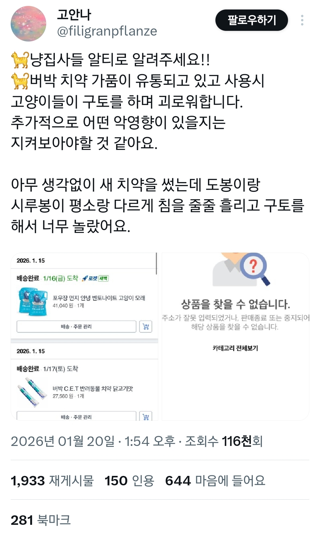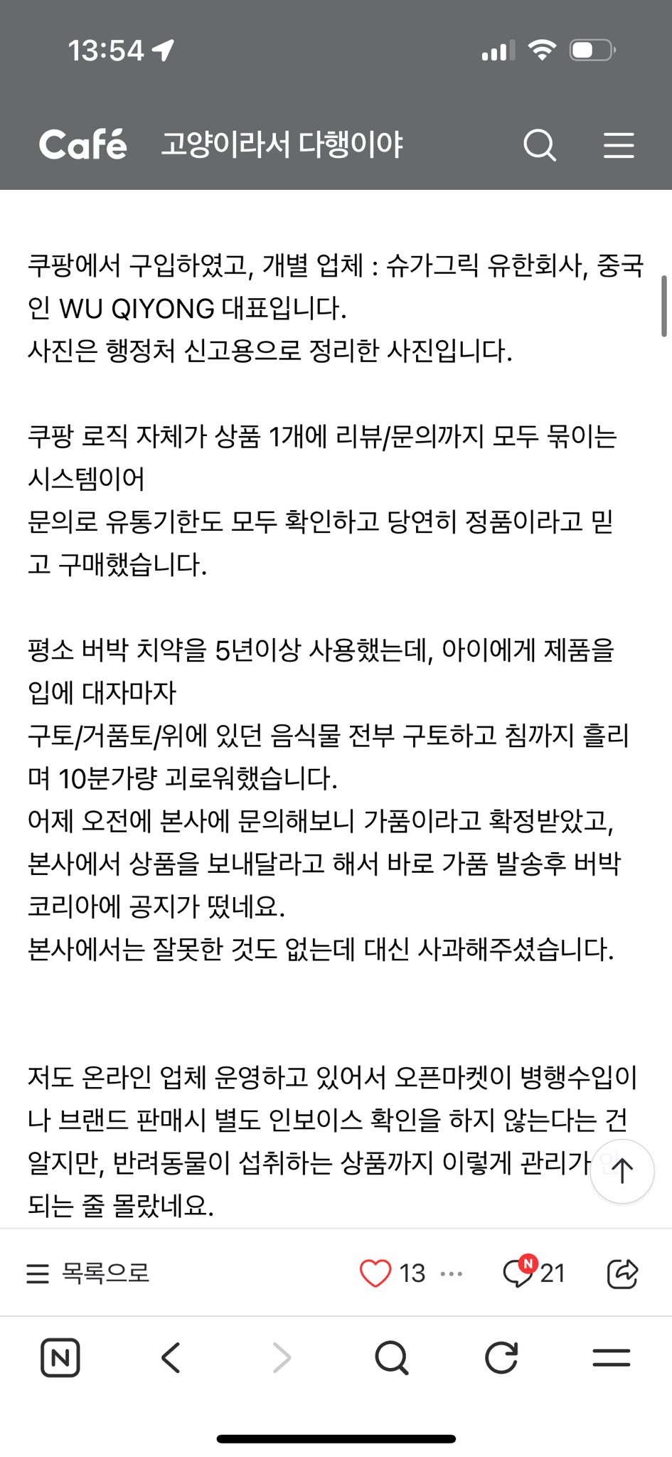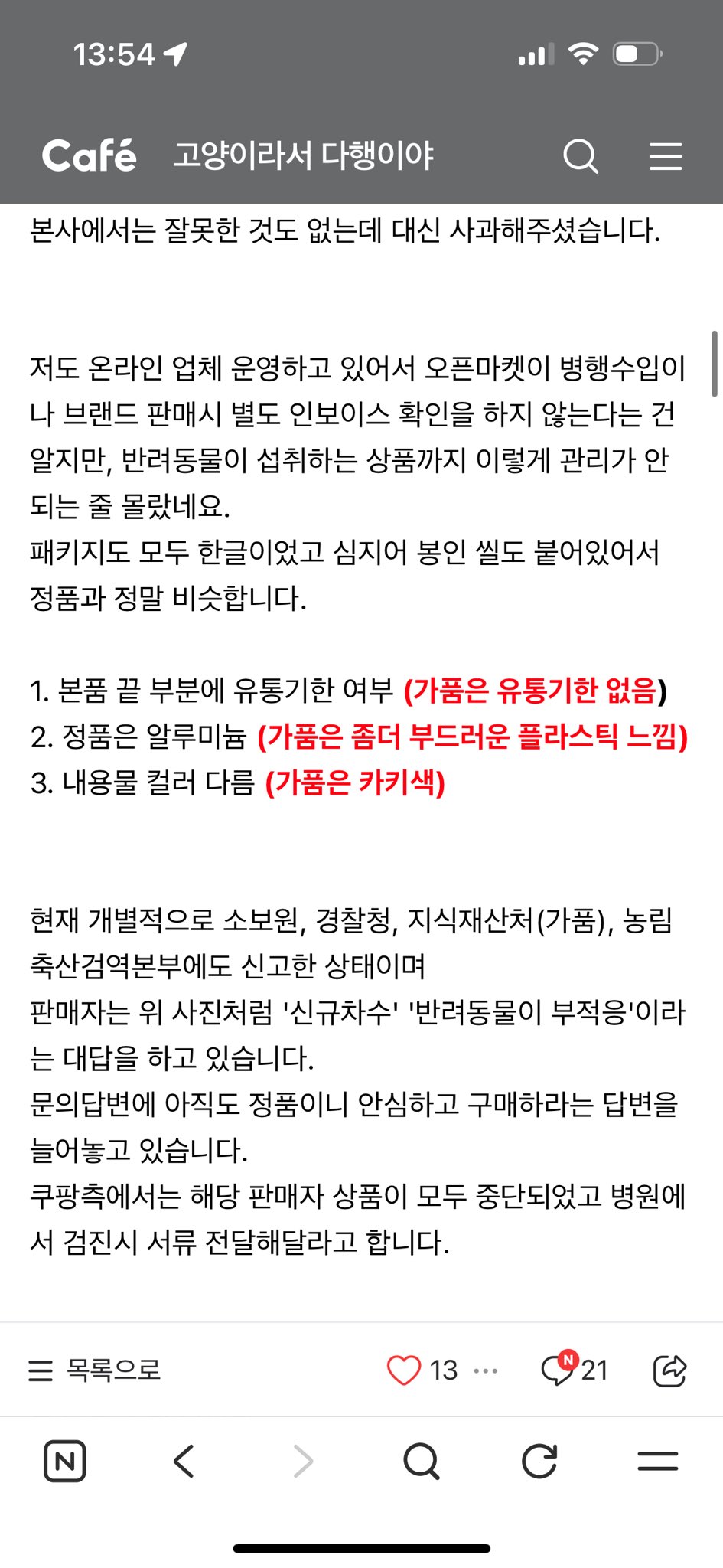 [칵.cxxx]쿠팡에서 버박 고양이치약 구매한 냥집사들 가품 꼭 확인해야함 + 쿠팡 무대응 작성자날계|작성시간26.01.21|조회수29,856 목록 댓글 68 글자크기 작게가 글자크기 크게가 출처: https://x.com/i/status/2013475174637805714네이버 카페에 올라온 피해사례글쿠팡은 대응 X 스탠스 다음검색 현재 게시글 추가 기능 열기 북마크 공유하기 신고 센터로 신고 댓글 댓글 68 댓글쓰기 답글쓰기 댓글 리스트 작성자오잉히히 | 작성시간 26.01.21 미쳤나진짜....하 작성자두비두비고양 | 작성시간 26.01.21 아오... 작성자트벅트벅 | 작성시간 26.01.21 쿠팡 진짜 ㅈ같이 구네 계속 한국에서 작성자인류의보석 | 작성시간 26.01.21 헉 ㅅㅂ 미쳤어???? 작성자잉걸앙걸 | 작성시간 26.02.09 아샤갈 ㅡㅡ 집가서 확인해봐야겠다ㅜㅜ 쿠팡 탈퇴해서 머 주문내역 확인도 못하겠네 댓글 전체보기