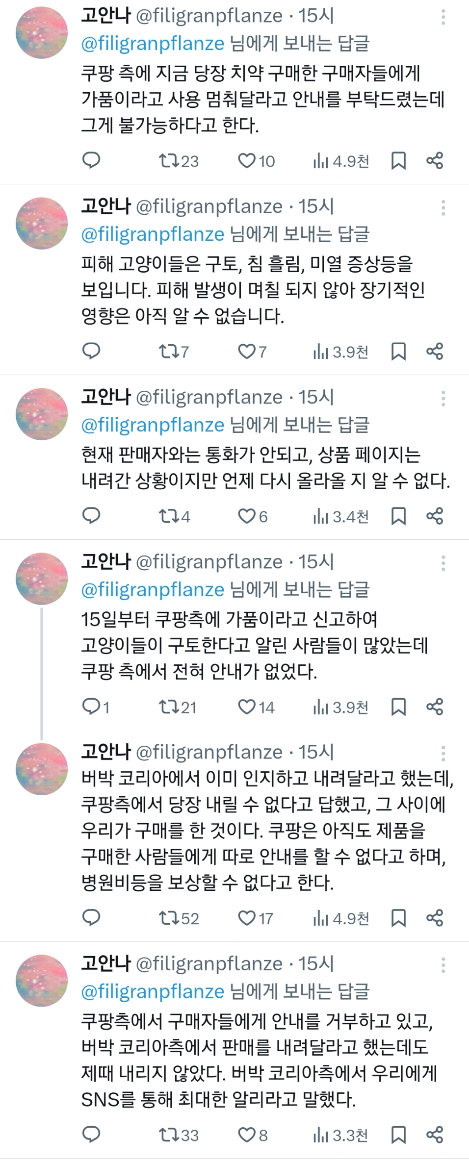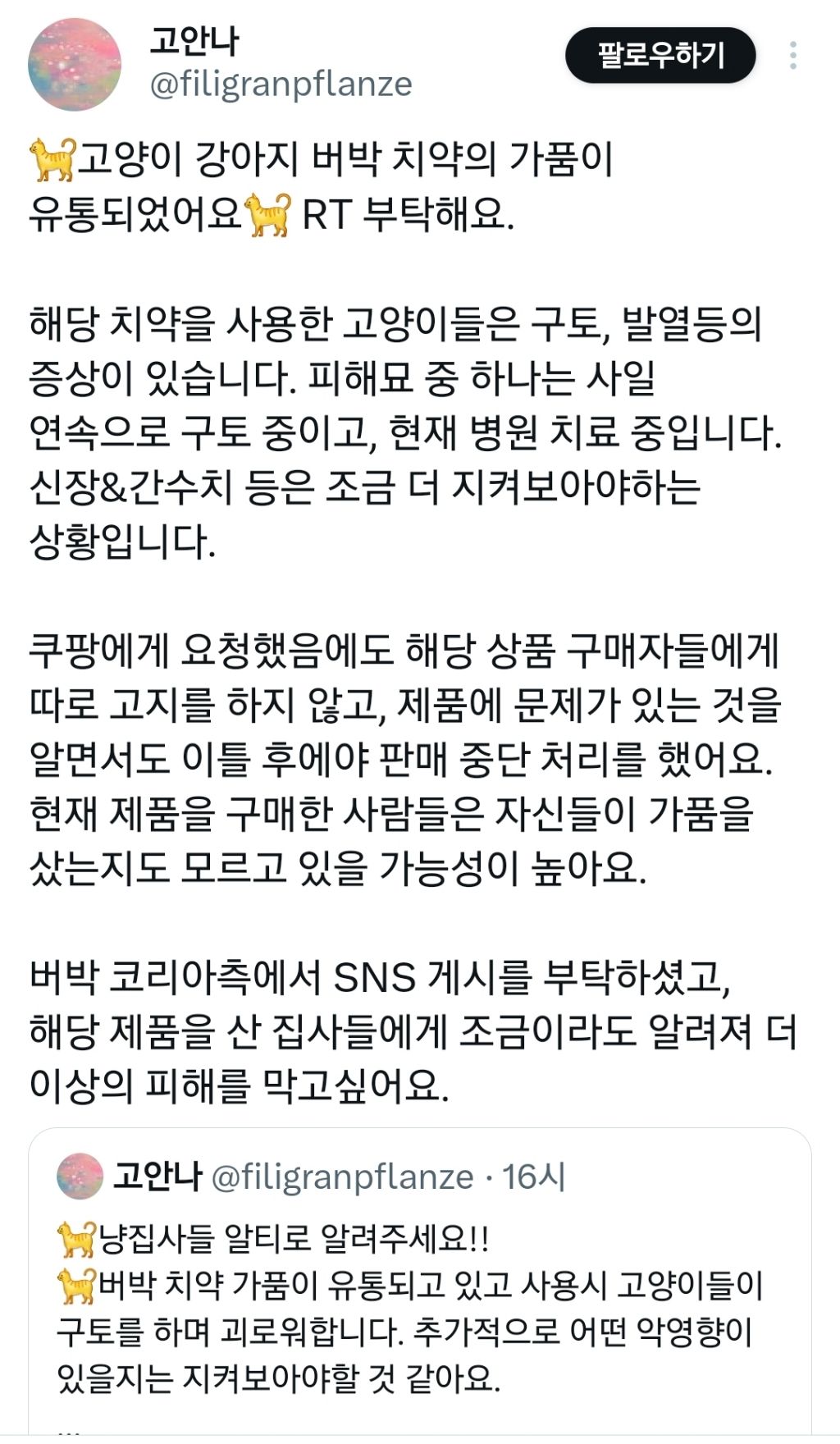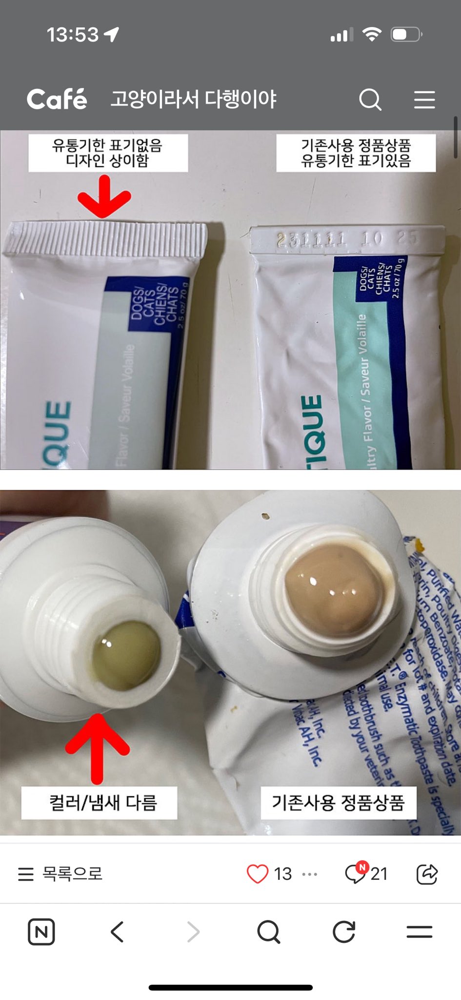 [칵.cxxx]쿠팡에서 버박 고양이치약 구매한 냥집사들 가품 꼭 확인해야함 + 쿠팡 무대응 작성자날계|작성시간26.01.21|조회수29,856 목록 댓글 68 글자크기 작게가 글자크기 크게가 출처: https://x.com/i/status/2013475174637805714네이버 카페에 올라온 피해사례글쿠팡은 대응 X 스탠스 다음검색 현재 게시글 추가 기능 열기 북마크 공유하기 신고 센터로 신고 댓글 댓글 68 댓글쓰기 답글쓰기 댓글 리스트 작성자오잉히히 | 작성시간 26.01.21 미쳤나진짜....하 작성자두비두비고양 | 작성시간 26.01.21 아오... 작성자트벅트벅 | 작성시간 26.01.21 쿠팡 진짜 ㅈ같이 구네 계속 한국에서 작성자인류의보석 | 작성시간 26.01.21 헉 ㅅㅂ 미쳤어???? 작성자잉걸앙걸 | 작성시간 26.02.09 아샤갈 ㅡㅡ 집가서 확인해봐야겠다ㅜㅜ 쿠팡 탈퇴해서 머 주문내역 확인도 못하겠네 댓글 전체보기