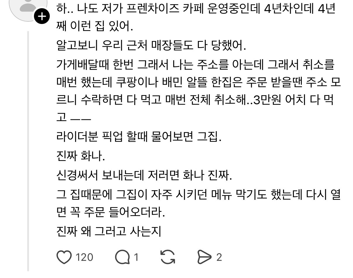 작성자뿡뿡아 작성시간 26.01.22 배달완료 후에 왜 취소가 가능한 거야...? 저 양심 없는 인간들 대체 뭐임