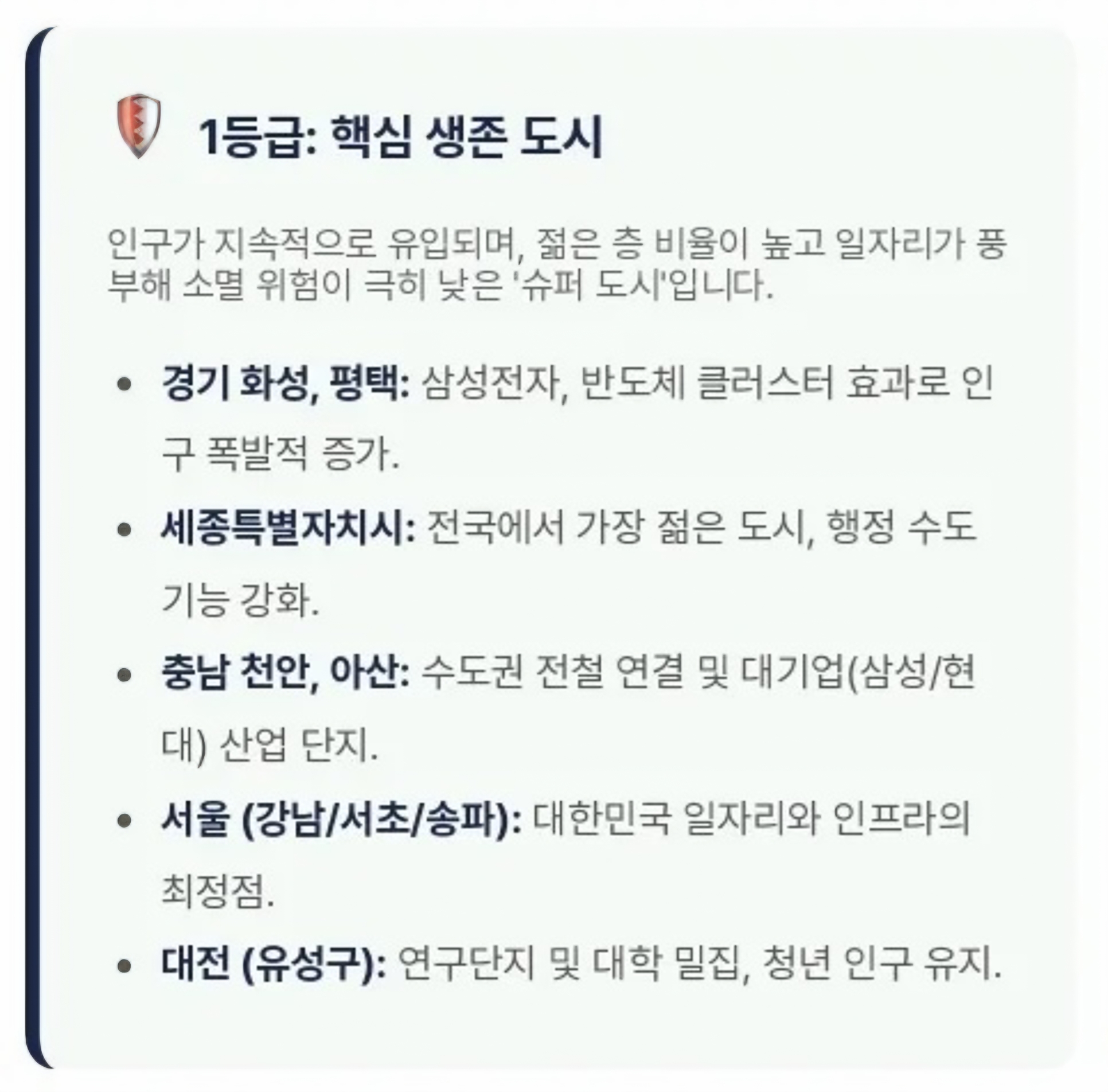 [흥미돋]2047년에 살아남는 도시 작성자악귀|작성시간26.01.21|조회수23,370 목록 댓글 36 글자크기 작게가 글자크기 크게가 출처: 여성시대 악귀 https://www.dmitory.com/issue/397407041 표시안된 곳은 소멸각인듯 다음검색 현재 게시글 추가 기능 열기 북마크 공유하기 신고 센터로 신고 댓글 댓글 36 댓글쓰기 답글쓰기 댓글 리스트 작성자고구마호소중 | 작성시간 26.01.21 힘내라 내 고향 작성자안 좋아할거면 귀엽지나 말든지 | 작성시간 26.01.21 전북은 전주 하나인거 실화인가요 작성자라끄베르 | 작성시간 26.01.21 엥 구리가 왜없지 ㅋㅋ 작성자피넛버터크크런치 | 작성시간 26.01.21 그럼 집값 좀 괜찮아지나.... 작성자락나카 | 작성시간 26.01.21 평택은 지금 평택사는 젊은이들이 일자리 없다고 난린데… 삼성만 보고 저러는게 맞는거야..? 댓글 전체보기