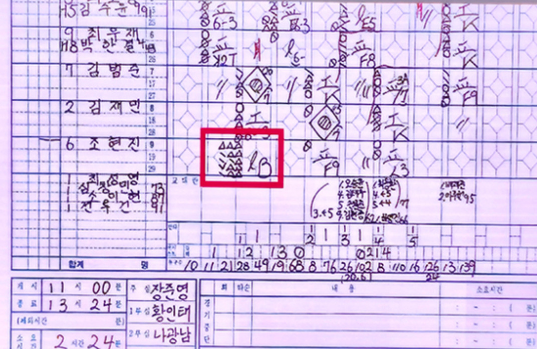 몇회에 이 타자가 어떻게 아웃되고 어떻게 안타를 치고 등이 들어가는 경기 기록지임
