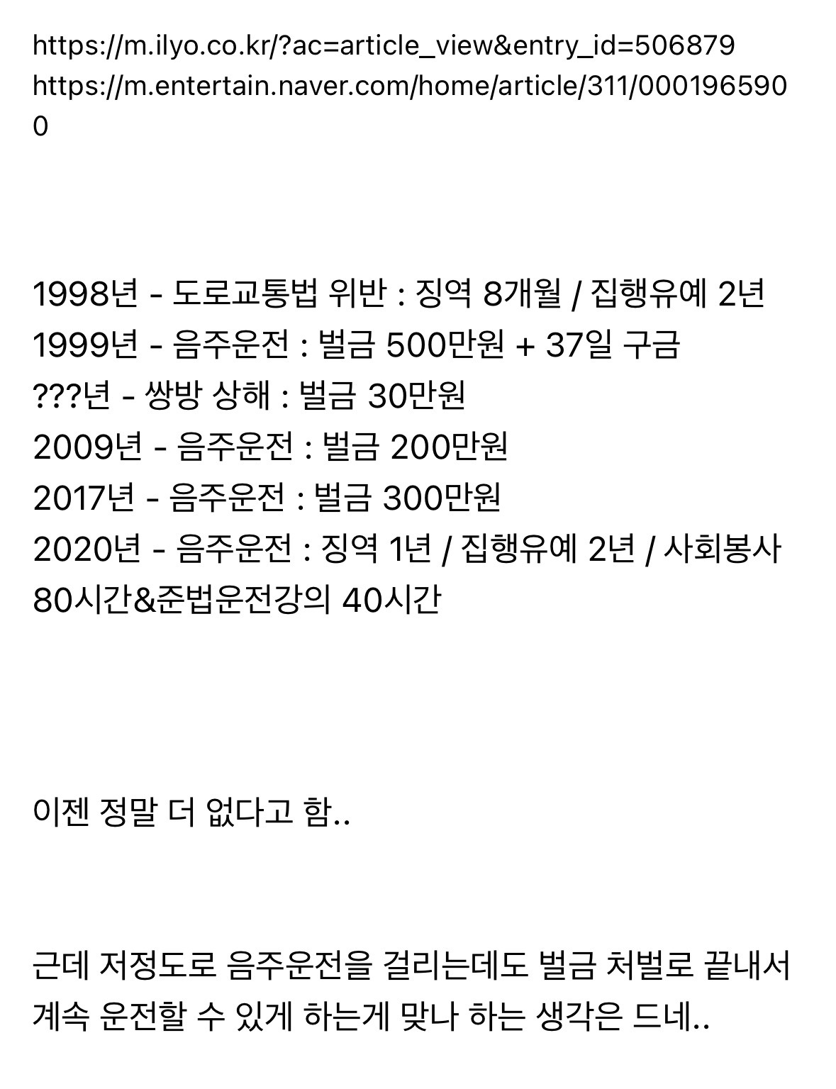 [흥미돋]확인된 임성근의 범죄 이력 정리 (3범 아님 / 4범 아님 / 5범 아님) 작성자Sunmoonstar02|작성시간26.01.21|조회수49,775 목록 댓글 138 글자크기 작게가 글자크기 크게가 출처: https://www.dmitory.com/issue/397434083이슈/유머 - 확인된 임성근의 범죄 이력 정리 (3범 아님 / 4범 아님 / 5범 아님)익명 정보 커뮤니티 사이트www.dmitory.com 다음검색 현재 게시글 추가 기능 열기 북마크 공유하기 신고 센터로 신고 댓글 댓글 138 댓글쓰기 답글쓰기 댓글 리스트 작성자따뜻한아가리카노 | 작성시간 26.01.22 정말 우리나라는 음주운전에 너무 관대해 작성자흙표범 | 작성시간 26.01.22 ㅡㅡ 작성자무둥이 | 작성시간 26.01.22 에휴 ㅅㅂ 나오지마라 걍 작성자히로시마붐붐붐 | 작성시간 26.01.22 걍 술먹고 운전하는 사람이잔아 작성자추나통헴 | 작성시간 26.01.22 미친 음주로 징역갈정도면 시한폭탄아니가 댓글 전체보기
