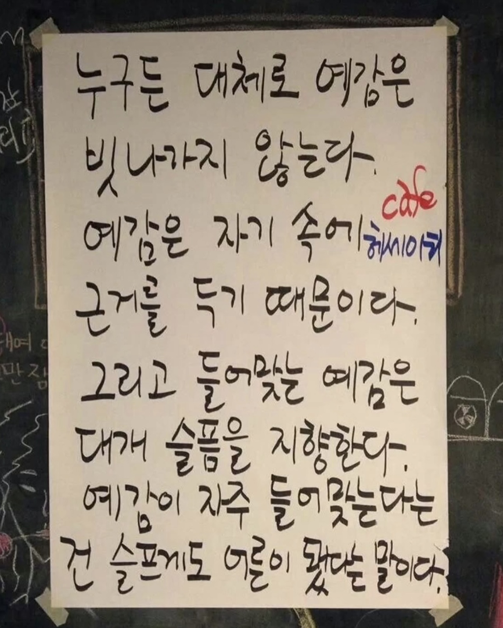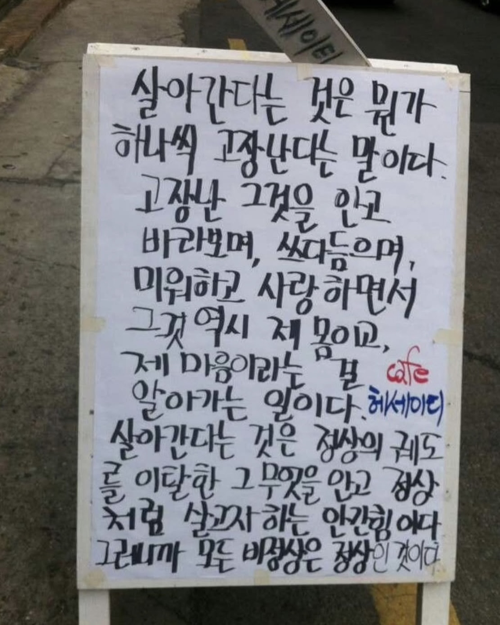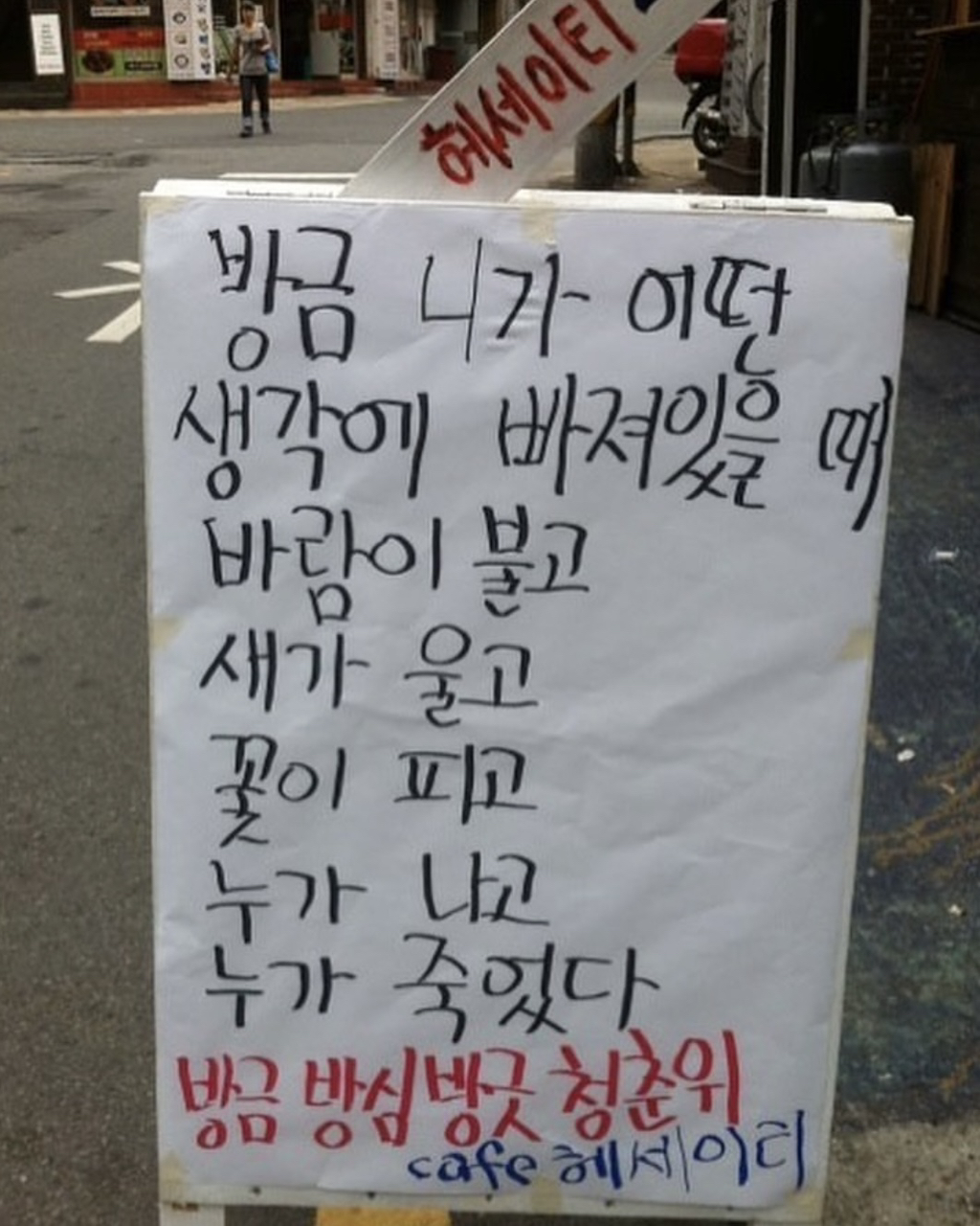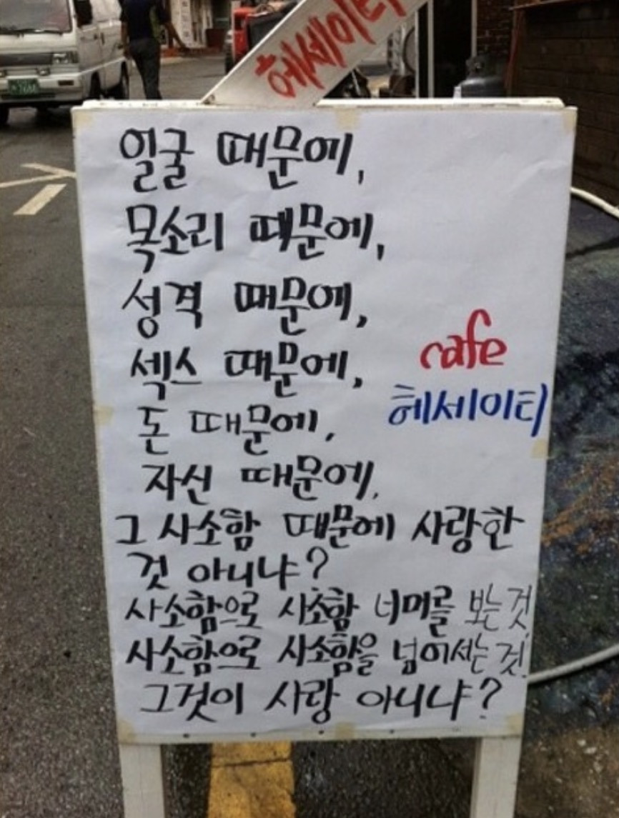 [흥미돋]황경민 시인의 카페 헤세이티 작성자비참한가요그럼나는어땠을까요|작성시간26.01.21|조회수3,535 목록 댓글 5 글자크기 작게가 글자크기 크게가 출처: 여성시대 비참한가요그럼나는어땠을까요중앙대 문예창작과 출신 황경민 시인이 운영하던 카페 헤세이티부산대에 위치해 시가 적혀있는 입간판으로 유명세를 타다, 현재 건강악화로 문을 닫았으며운영 10년동안 2000건이 넘는 간판 글귀를 썼다고 알려짐 다음검색 현재 게시글 추가 기능 열기 북마크 공유하기 신고 센터로 신고 댓글 댓글 5 댓글쓰기 답글쓰기 댓글 리스트 작성자졸업앨범 | 작성시간 26.01.21 오 그런거였구나 작성자조리퐁리 | 작성시간 26.01.21 와 글귀 조타… 작성자근육빵빵 | 작성시간 26.01.21 좋다 작성자미니멀하려고 | 작성시간 26.01.21 헐 아쉽다... 작성자허름한헤세 | 작성시간 26.01.21 어머 시인이셨구나.. 댓글 전체보기