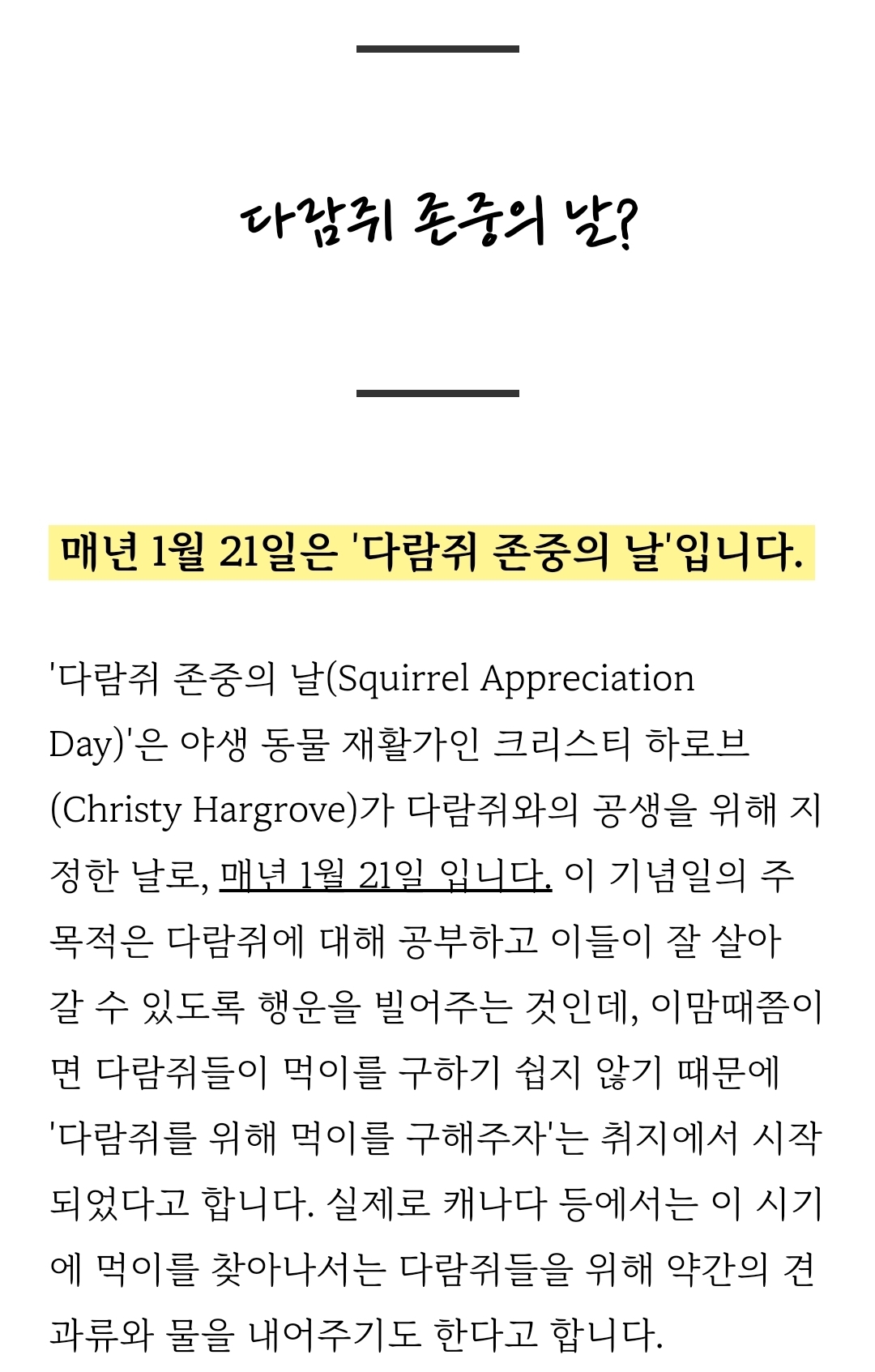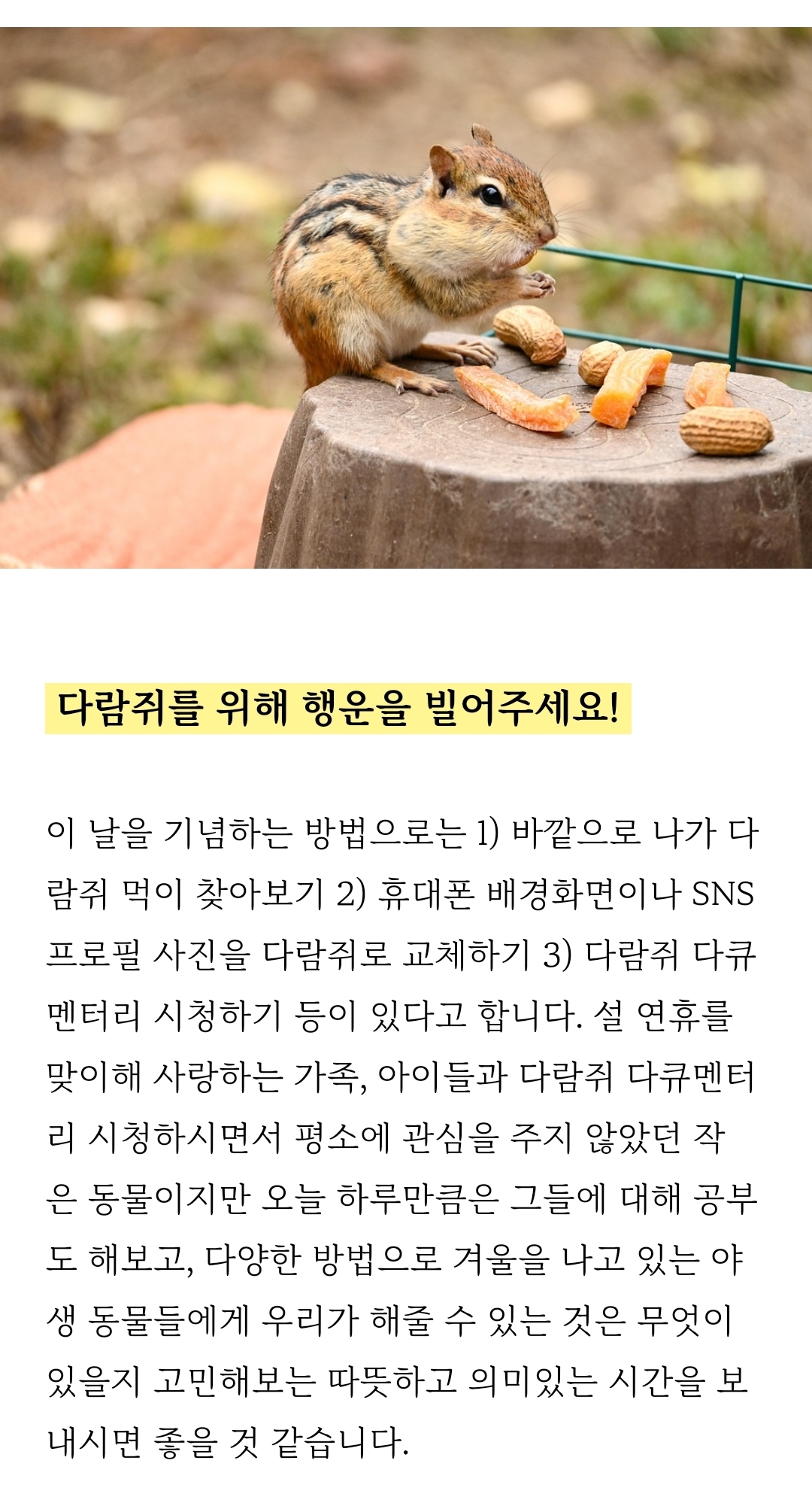 [흥미돋]매년 1월 21일은 '다람쥐 존중의 날'입니다 작성자COPY BARA|작성시간26.01.21|조회수4,673 목록 댓글 12 글자크기 작게가 글자크기 크게가 출처: https://naver.me/59UG9V6R[다람쥐 존중의 날] 매년 1월 21일 '다람쥐 존중의 날' #Squirrel_Appreciation_Day"Squirrel Appreciation Day" #다람쥐 #다람쥐_존중의_날 #Squirrel_Appreciation_Day - ...blog.naver.com 다음검색 현재 게시글 추가 기능 열기 북마크 공유하기 신고 센터로 신고 댓글 댓글 12 댓글쓰기 답글쓰기 댓글 리스트 작성자밤톨한톨 | 작성시간 26.01.21 헐 어쩐지 오늘 자동 바탕화면 귀여운 람쥐였음 이미지 확대 작성자러브윈즈올 | 작성시간 26.01.21 🐿🐿🐿 작성자lily of the valley | 작성시간 26.01.21 ㅠㅜㅜ 요즘 람쥐들 잘 동면중이지??이세상 모든 다람쥐들이 건강하고 행복하길🥜🐿️🤎 작성자일찍자자제발요 | 작성시간 26.01.21 너무 귀엽다 ㅠㅠ 다람쥐들아 행복해🌰🫶 작성자방황하는단무지 | 작성시간 26.01.22 존중합니다🤎🐿️🌳 댓글 전체보기