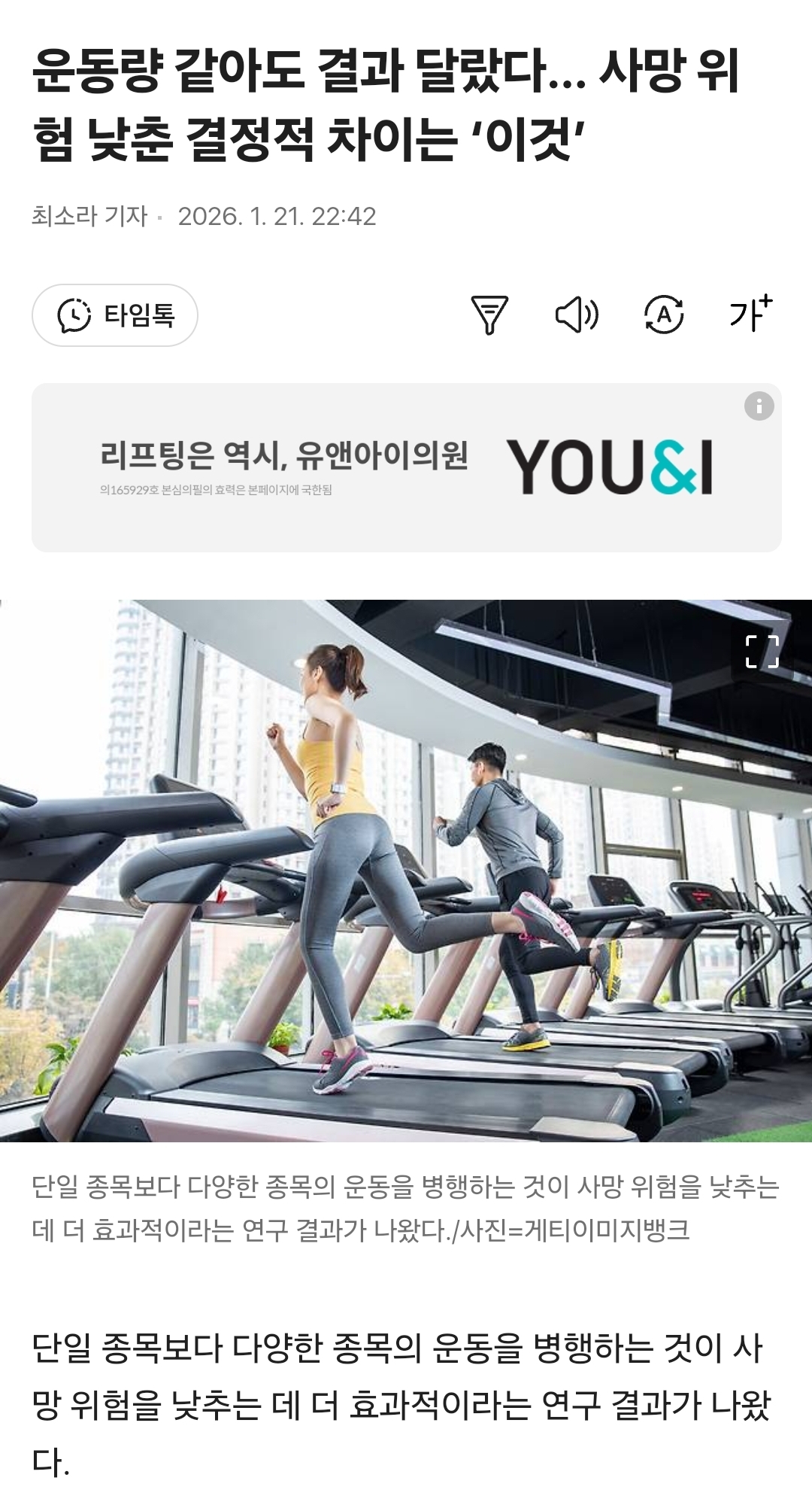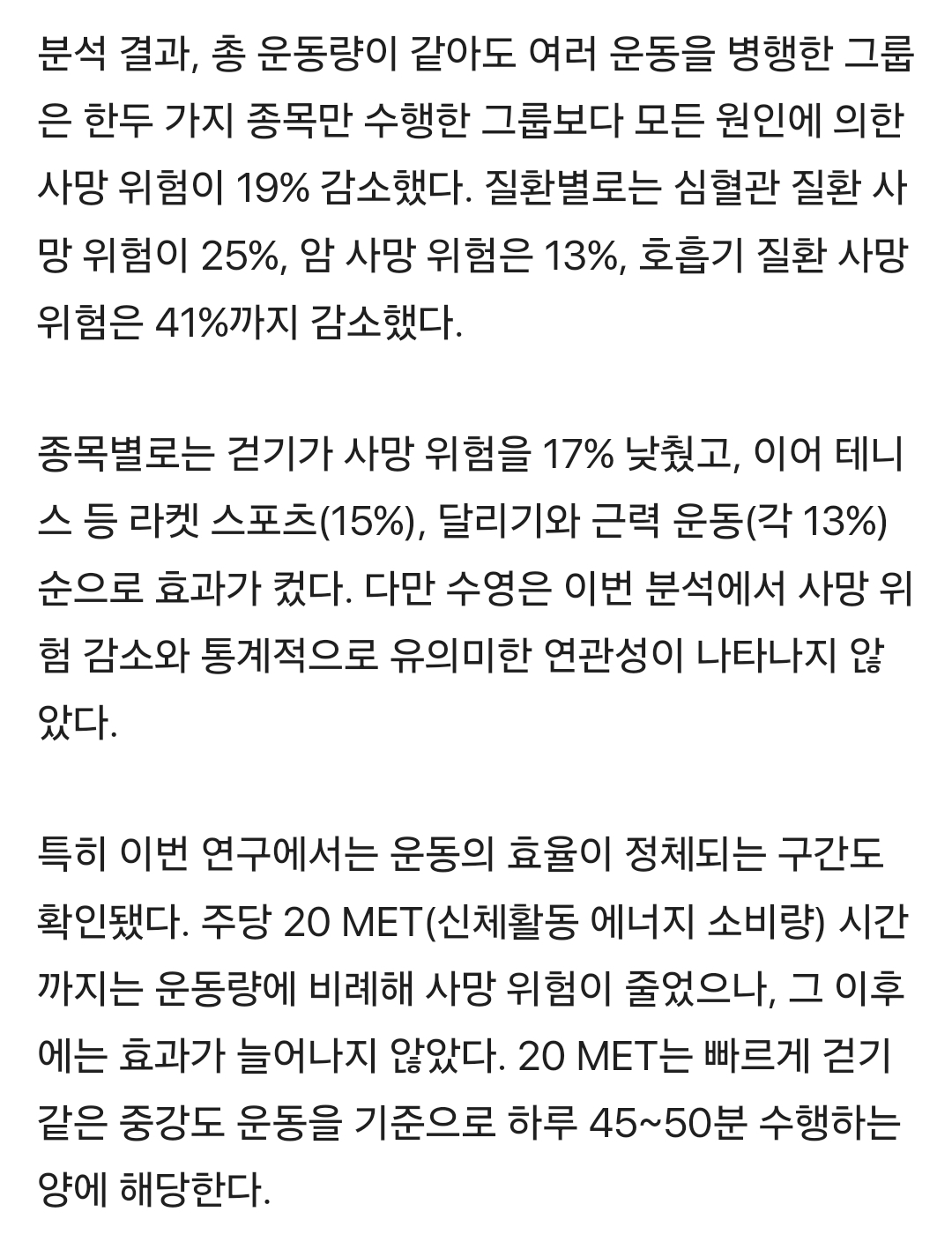 [여시뉴스데스크]운동량 같아도 결과 달랐다… 사망 위험 낮춘 결정적 차이는 ‘이것’ 작성자어쩌면좋아|작성시간26.01.21|조회수21,895 목록 댓글 9 글자크기 작게가 글자크기 크게가 출처: https://v.daum.net/v/20260121224225506 ...... 전문은 출처로.. 다음검색 현재 게시글 추가 기능 열기 북마크 공유하기 신고 센터로 신고 댓글 댓글 9 댓글쓰기 답글쓰기 댓글 리스트 작성자나브시로 | 작성시간 26.01.22 오오…마침 운동 시작햇는데… 오래살 수 잇다니 행복하다 ㅎㅎ 정보 고마워 ! 작성자파스타덕후 | 작성시간 26.01.22 일년마다 운동종목 바꾸는데 잘하고잇엇던거엿군 답댓글 작성자실내슬리퍼 | 작성시간 26.01.22 동시에 병행하라는거아닐까? 작성자생각좀해라 | 작성시간 26.01.22 ....수영만 하는데... 작성자고마핑깡총핑 | 작성시간 26.01.22 수영은 왜?! 댓글 전체보기