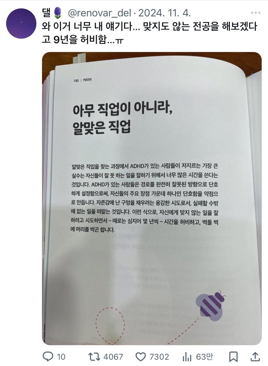 작성자딸기찰쌉떡 작성시간 26.01.22 허비라고 생각 안함 그 시간이 있었으니까 맞는 직업 찾았지 앞으로도 계속 방황하고 실패할 건데? adhd는 어차피 평생 수련이야
