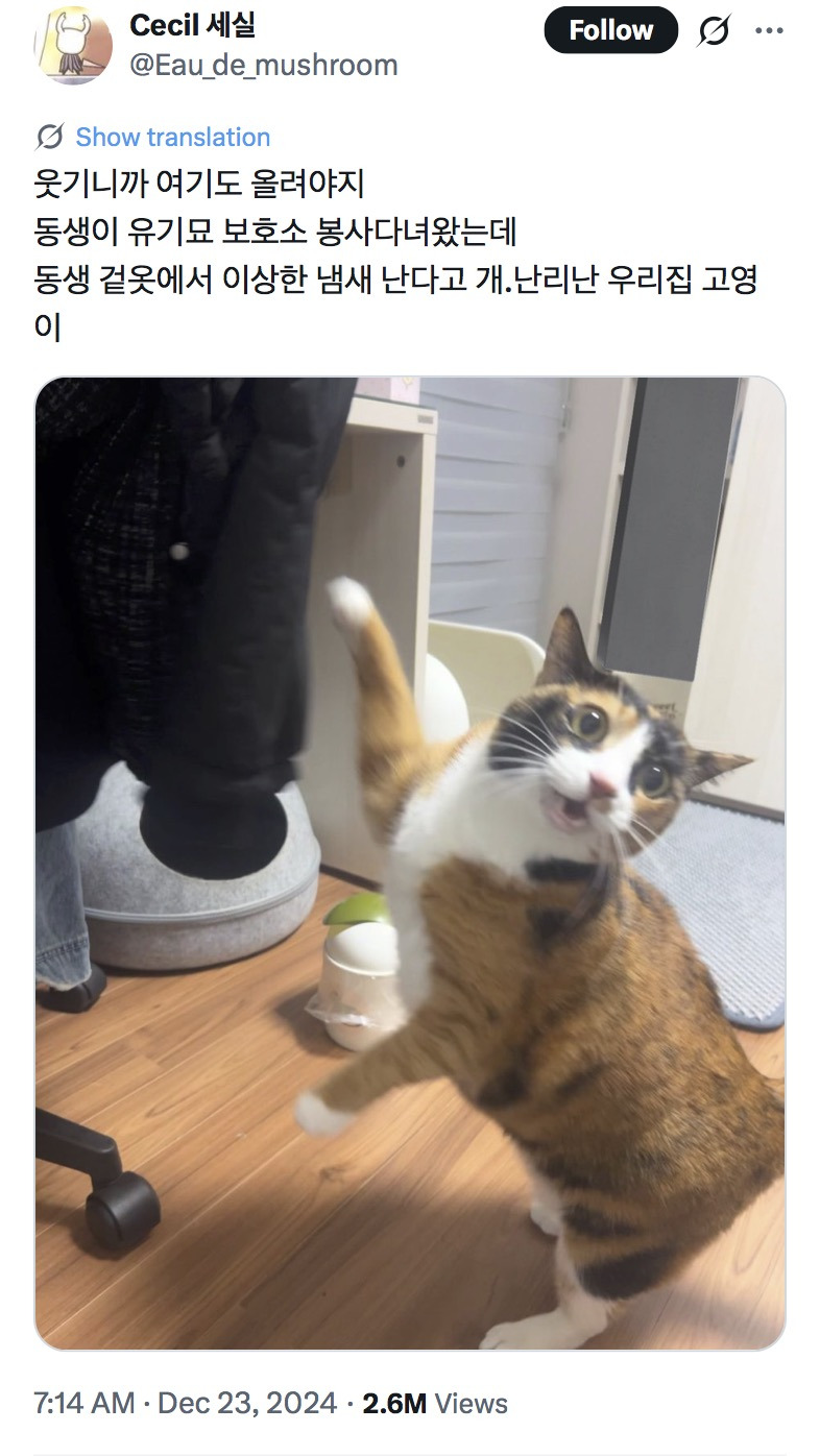 [흥미돋]웃기니까 여기도 올려야지 동생이 유기묘 보호소 봉사다녀왔는데 동생 겉옷에서 이상한 냄새 난다고 개.난리난 우리집 고영이 작성자Sunmoonstar02|작성시간26.01.22|조회수17,342 목록 댓글 17 글자크기 작게가 글자크기 크게가 출처: https://x.com/Eau_de_mushroom/status/1871212698584924297?s=20X의 Cecil 세실님(@Eau_de_mushroom)웃기니까 여기도 올려야지 동생이 유기묘 보호소 봉사다녀왔는데 동생 겉옷에서 이상한 냄새 난다고 개.난리난 우리집 고영이x.com 다음검색 현재 게시글 추가 기능 열기 북마크 공유하기 신고 센터로 신고 댓글 댓글 17 댓글쓰기 답글쓰기 댓글 리스트 작성자bitter melon | 작성시간 26.01.22 아 귀여워 ㅋㅋㅋㅋㅋㅋㅋㅋ 작성자굴러간다 | 작성시간 26.01.22 어떤냥이야!!! 작성자ㄷㄷㅇㅌㄹ | 작성시간 26.01.22 ㄱㅇㅇ 작성자곽제강 | 작성시간 26.01.22 아진짜너무귀여운거아닌가 작성자하루야채베리 | 작성시간 26.01.22 ㅋㅋㅋㅋㅋㅋ 귀여워 댓글 전체보기
