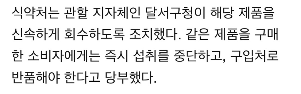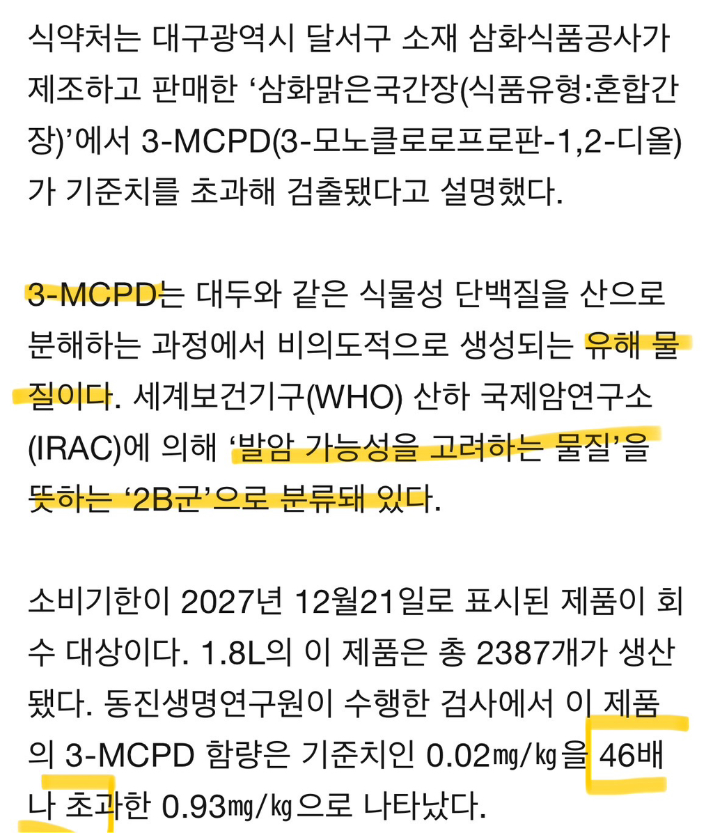 [여시뉴스데스크]“이 간장 있다면 먹지 마세요” 긴급 회수…유해 물질 기준치 46배 초과 작성자솜사|작성시간26.01.22|조회수41,501 목록 댓글 5 글자크기 작게가 글자크기 크게가 출처: 여성시대 솜사https://www.segye.com/newsView/20260122502718“이 간장 있다면 먹지 마세요” 긴급 회수…유해 물질 기준치 46배 초과식품의약품안전처는 시중에서 유통 중인 삼화식품공사의 ‘삼화맑은국간장’에서 기준치를 넘은 유해 물질이 검출됨에 따라 해당 제품 판매 중단과 긴급 회수 조치에 나섰다고 22일 밝혔다. 식www.segye.com 다음검색 현재 게시글 추가 기능 열기 북마크 공유하기 신고 센터로 신고 댓글 댓글 5 댓글쓰기 답글쓰기 댓글 리스트 작성자체크토끼 | 작성시간 26.01.22 엥 우리집국간장인디..삼화진간장도쓰는데.. 답댓글 작성자파도부는마음 | 작성시간 26.01.22 나도 국간장 쓰던거임 날짜는 다른데 열받는다ㅠ 작성자암해피 | 작성시간 26.01.22 먹는 거 가지고 장난치지 마라 진짜 작성자클쓰면뭐해 내통장 텅장 | 작성시간 26.01.22 샘표만쓴다 작성자대영견 | 작성시간 26.01.22 그래서 산분해간장 먹지 말라고 함,,성분표 잘 봐야 하냄 댓글 전체보기