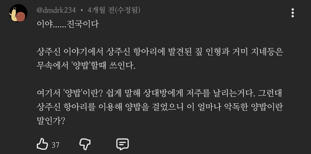 답댓글 작성자자정 잉어 작성자 본인 여부 작성자 작성시간 26.01.23 헤헤헿 이런 한국민속괴담 너무 재밌지않아? 무속이야기 너무 사이비로만 취급되어서 슬픔.. 얼마나 재밌는 요소가 많은데..
