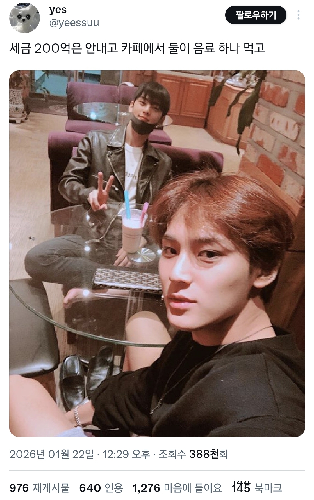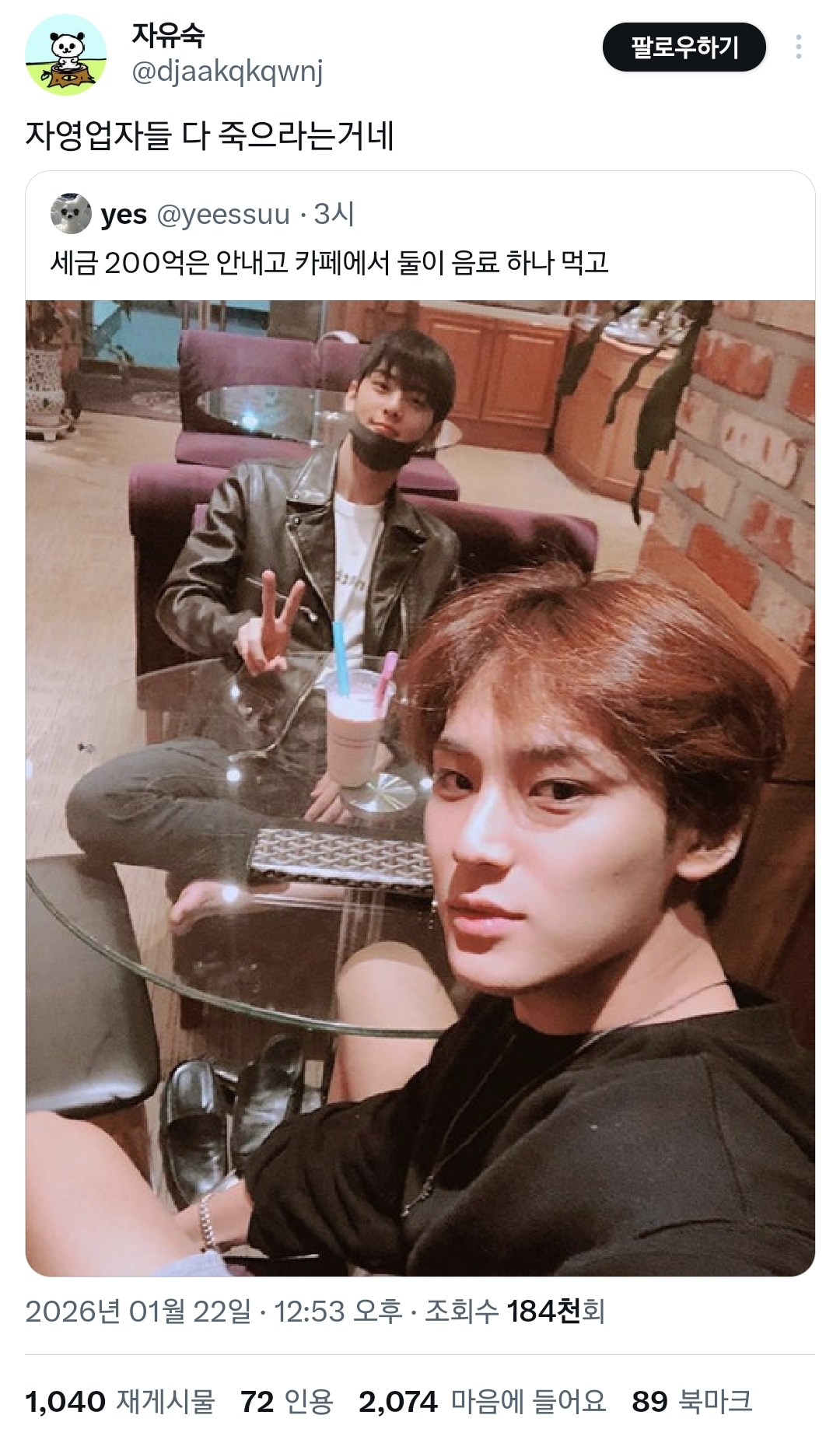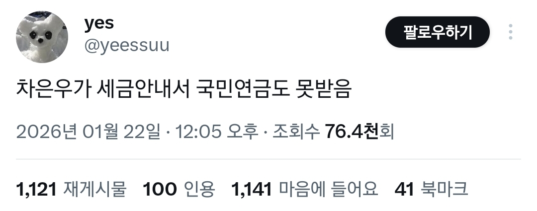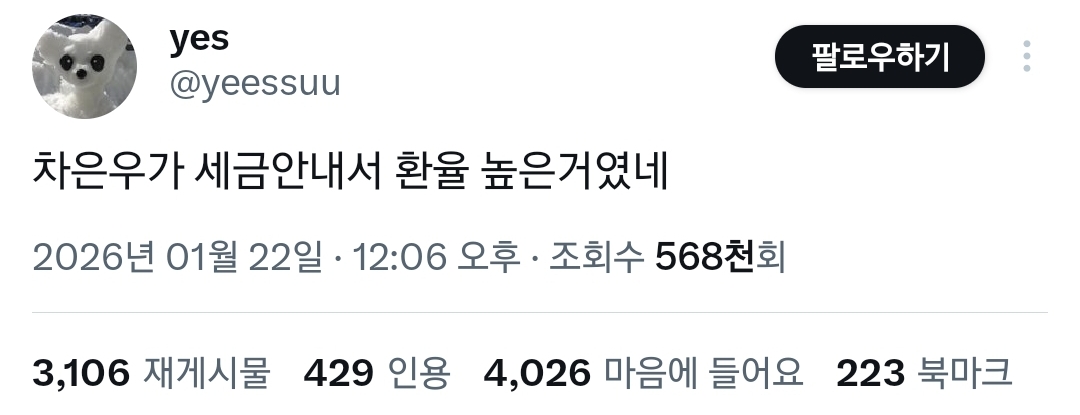 [흥미돋]차은우가 세금 안 내서 환율 높은 거였네.twt 작성자스피또띠아|작성시간26.01.22|조회수68,009 목록 댓글 217 글자크기 작게가 글자크기 크게가 출처: https://x.com/i/status/2014172709601546331 여성시대 스피또띠아전 재산 사회에 환원해서 나라 경제 되살려라 다음검색 현재 게시글 추가 기능 열기 북마크 공유하기 신고 센터로 신고 댓글 댓글 217 댓글쓰기 답글쓰기 댓글 리스트 작성자달걀이삶이다 | 작성시간 26.01.23 ㅅㅂ 개웃기닼ㅋㅋㅋㅋㅋㅋㅋㅋㅋㅋㅋㅋㅋㅋㅋㅋㅋㅋㅋㅋㅋㅋㅋㅋㅋㅋㅋㅋㅋㅋㅋㅋㅋㅋㅋㅋㅋㅋㅋㅋㅋㅋㅋㅋㅋㅋㅋㅋ 작성자로재파스타 | 작성시간 26.01.23 ㅋㅋㅋㅋㅋㅋㅅㅂㅋㅋㅋㅋㅋ 작성자정국윈터이건된다 | 작성시간 26.01.23 세금내 시발롬아 작성자엽떡맛있어요 | 작성시간 26.01.24 당장내 십알 작성자하루이틀삼일사일 | 작성시간 26.01.26 코로나때 클럽갔잖아 댓글 전체보기