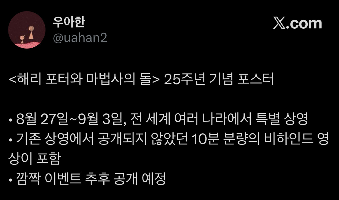 [흥미돋]<해리 포터와 마법사의 돌> 25주년 기념 포스터 작성자커피캡슐|작성시간26.01.22|조회수15,548 목록 댓글 32 글자크기 작게가 글자크기 크게가 출처: https://x.com/uahan2/status/2014118733883769261 다음검색 현재 게시글 추가 기능 열기 북마크 공유하기 신고 센터로 신고 댓글 댓글 32 댓글쓰기 답글쓰기 댓글 리스트 작성자반만년 우뚝 설 우리 샛별 | 작성시간 26.01.22 이야... 어릴 때 언니랑 언니 친구들 따라서 극장에서 1편 봤었는데그게 25년 전이구나 작성자히비스커스 티 | 작성시간 26.01.22 간다 작성자칫솔마데카솔 | 작성시간 26.01.22 나가질래 작성자ㅡㅅㅡa | 작성시간 26.01.22 포스터좀 줘ㅠㅠ영화관에서 작성자아이스라떼연하게한잔이요 | 작성시간 26.01.23 나도줘 댓글 전체보기