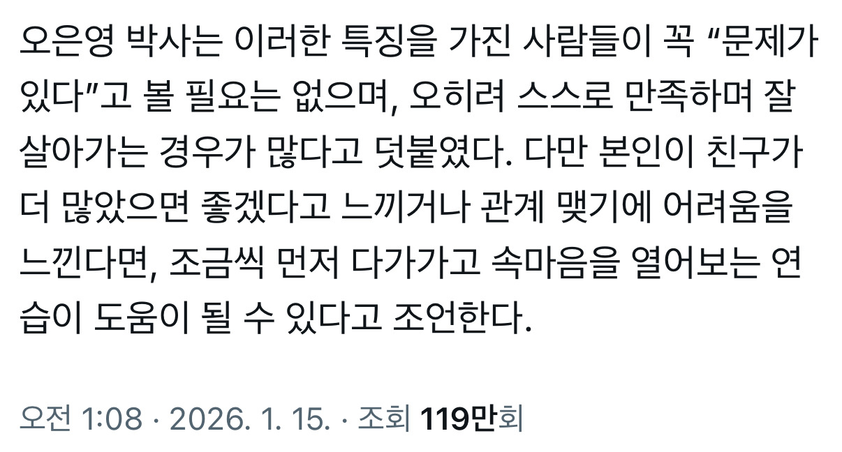 작성자포동포동포동 작성시간 26.01.23 나다.... 그냥 혼자가 편하구 좋아 친구는 가끔 만나는게 좋음 ㅜㅜ