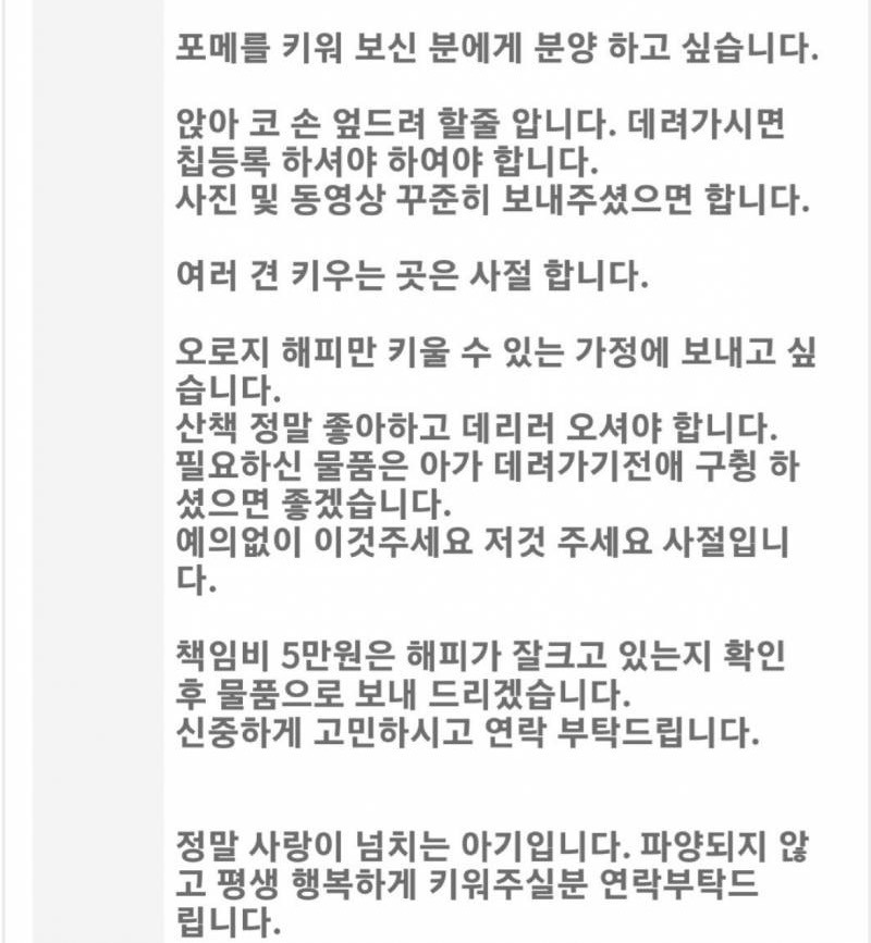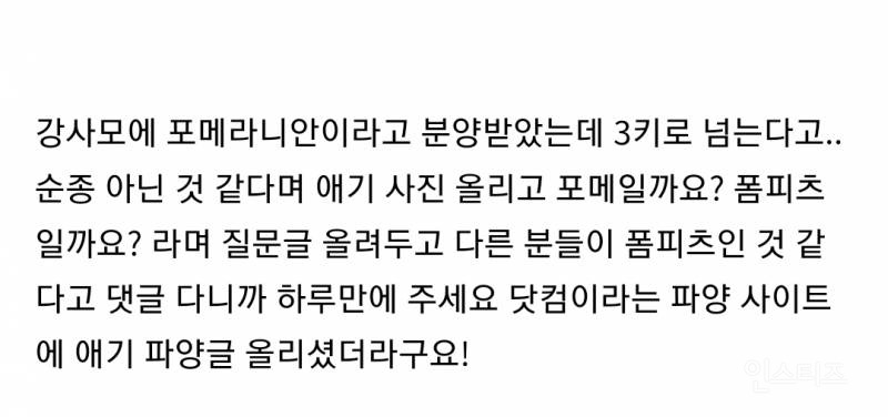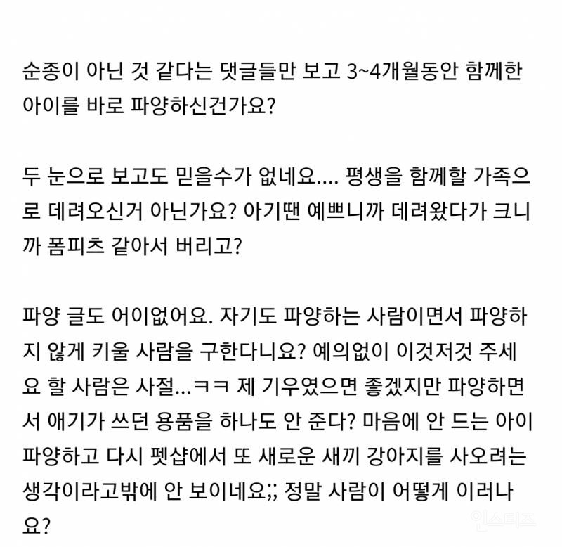 [흥미돋]포메 맞냐고 묻고, 폼피츠 같다 하니 바로 파양... 작성자모낙카|작성시간26.01.22|조회수11,536 목록 댓글 32 글자크기 작게가 글자크기 크게가 출처: 여성시대 모낙카https://www.instiz.net/pt/7395414... 다음검색 현재 게시글 추가 기능 열기 북마크 공유하기 신고 센터로 신고 댓글 댓글 32 댓글쓰기 답글쓰기 댓글 리스트 작성자Sean O‘pry | 작성시간 26.01.23 포메인지 폼피츠인지가 뭐가 중요해 ㅅㅂ;;;;; 작성자2:22 | 작성시간 26.01.23 헐... 커서 더 예쁜데... 폼피인게 뭐가 문제지..? 작성자또리누나 | 작성시간 26.01.23 신종정병 작성자도파민도도파민도파민민 | 작성시간 26.01.23 존나기여운데 미친 인간 작성자이에로사이다있어요 | 작성시간 26.01.23 버리는주제에 주기적으로 사진은보내달라니 미친건가 댓글 전체보기