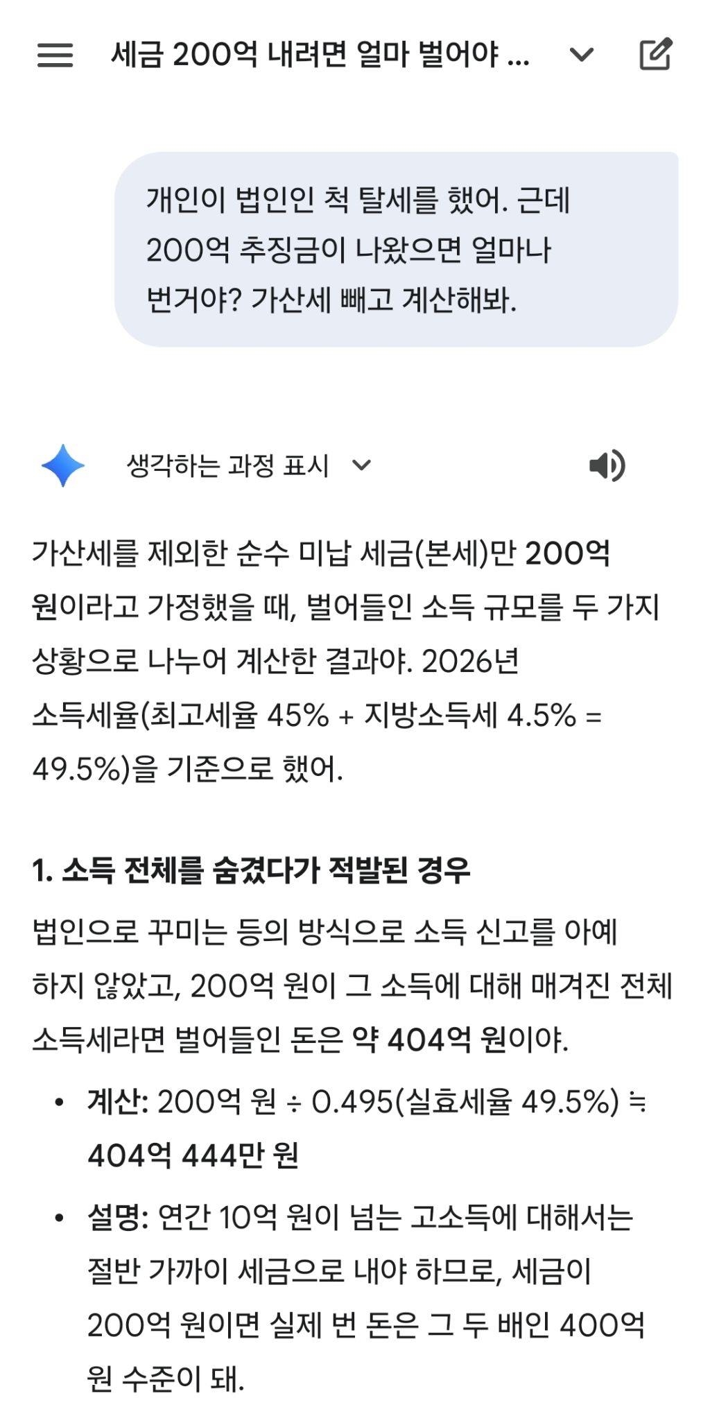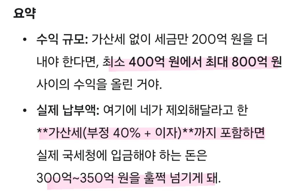 [흥미돋]200억을 세금으로 내려면 얼마나 벌어야 할까? (feat. 차은우) 작성자우렌지|작성시간26.01.22|조회수82,698 목록 댓글 170 글자크기 작게가 글자크기 크게가 출처: 여성시대 우렌지 1000억 번거 아녀? 라는 댓글이 많아서 순수 호기심으로 찾아봄 제미나이 틀렸을 수 있지만 대충 800억 정도 벌었을 것으로 추정 가산세 포함해서 300억 내라 다음검색 현재 게시글 추가 기능 열기 북마크 공유하기 신고 센터로 신고 댓글 댓글 170 댓글쓰기 답글쓰기 댓글 리스트 작성자옥수수킬러 | 작성시간 26.01.23 와 저렇게 버는구나 연예인들은.. 불쌍한 직장인 ㅠ 맨날 세금만 떼이고 작성자윤계상. | 작성시간 26.01.23 와 저만큼을 개인이 버는게 맞나 작성자기여벙 | 작성시간 26.01.23 개꿀이다 진짜 작성자아버지 저 구예요 | 작성시간 26.01.23 연기도 못하면서 작성자초등필독서컬렉션 | 작성시간 26.01.23 진짜 개현타오네 댓글 전체보기
