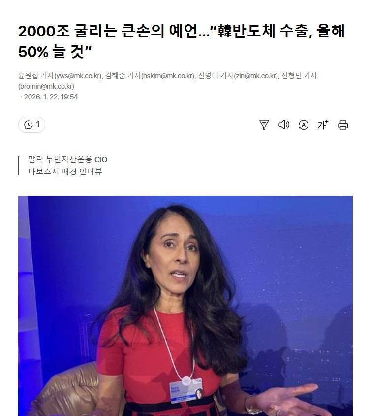 [여시뉴스데스크]2000조 굴리는 큰손의 예언…“韓반도체 수출, 올해 50% 늘 것” 작성자정동남|작성시간26.01.23|조회수6,049 목록 댓글 20 글자크기 작게가 글자크기 크게가 출처: https://v.daum.net/v/202601221954006202000조 굴리는 큰손의 예언…“韓반도체 수출, 올해 50% 늘 것”코스피가 ‘반도체 랠리’에 힘입어 사상 최초로 5000선을 돌파한 가운데 글로벌 ‘큰손’이 한국 반도체 기업의 슈퍼사이클이 내년까지 이어질 것이라고 예견했다. 사이라 말리크 누빈자산운v.daum.net 다음검색 현재 게시글 추가 기능 열기 북마크 공유하기 신고 센터로 신고 댓글 댓글 20 댓글쓰기 답글쓰기 댓글 리스트 작성자또리누나 | 작성시간 26.01.23 반도체회사취업하고싶다 작성자어디드 | 작성시간 26.01.23 현금 다 털어요? 작성자도시락바지락도락이다 | 작성시간 26.01.23 드가를 또 드가 작성자아무닉네임임 | 작성시간 26.01.23 오.. 작성자이번주로또1등하고퇴사할거야 | 작성시간 26.01.23 하닉 줍줍 댓글 전체보기