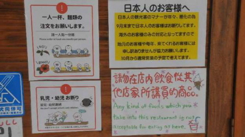 어느 음식점에서 일본인 출입금지 설명문을 붙여놓고 10월까지 외국인 관광객 손님만 받겠다고 함.