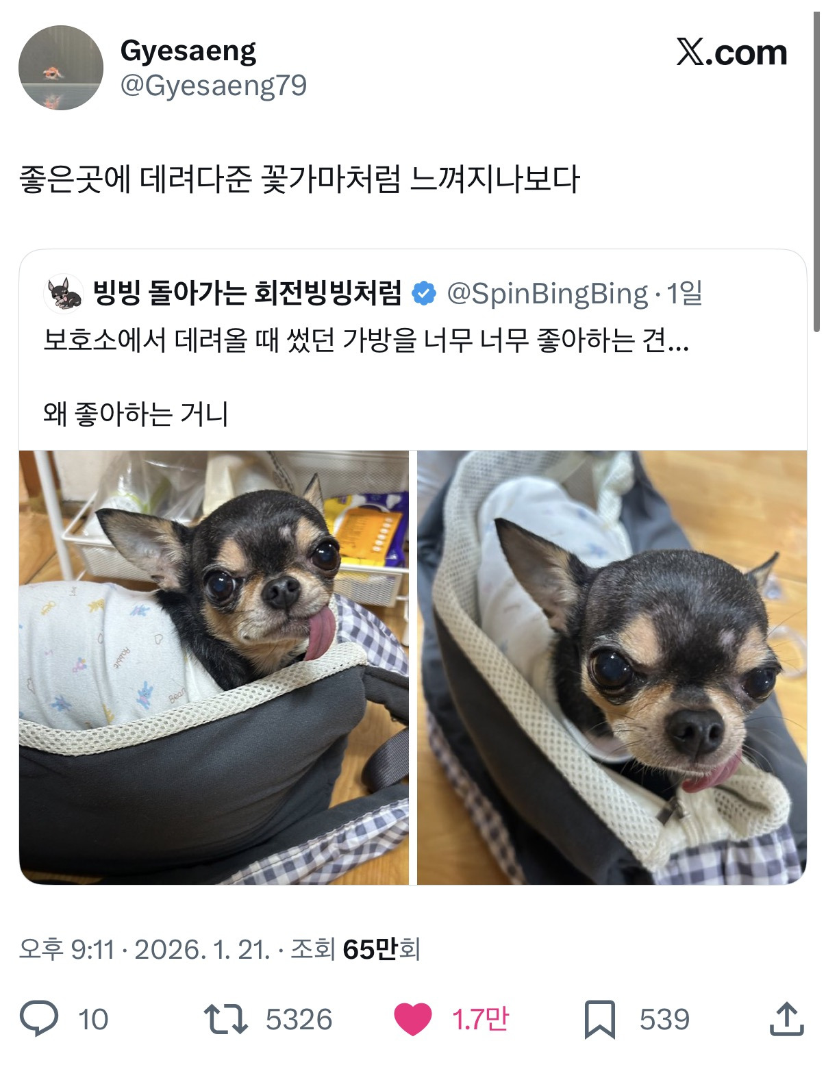 [흥미돋]보호소에서 데려올 때 썼던 가방을 너무 너무 좋아하는 견...twt 작성자셉템버|작성시간26.01.23|조회수39,917 목록 댓글 15 글자크기 작게가 글자크기 크게가 출처: 여성시대 셉템버https://x.com/gyesaeng79/status/2013947656821789095?s=46 다음검색 현재 게시글 추가 기능 열기 북마크 공유하기 신고 센터로 신고 댓글 댓글 15 댓글쓰기 답글쓰기 댓글 리스트 작성자강수혜 | 작성시간 26.01.23 쟤랑 같이 왔으니까... 작성자효효효횽 | 작성시간 26.01.23 이거 타고 왔더니 너무 좋은곳이였어 이런걸까 작성자건.들.기.만.해.봐 | 작성시간 26.01.23 히밣 ㅜㅜ 작성자친일파꺼져펫샵충꺼져 | 작성시간 26.01.23 저거 타고 온 곳이 너무 좋아서 그런가봐 ㅠㅠㅠㅠㅠ 작성자내고향홍천 | 작성시간 26.01.23 꽃가마ㅠㅠㅠㅠㅠㅠ 댓글 전체보기