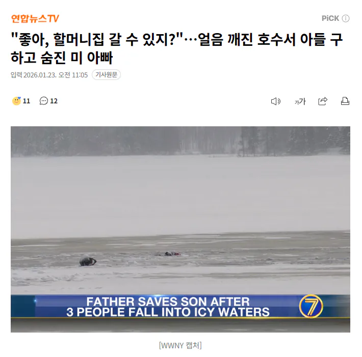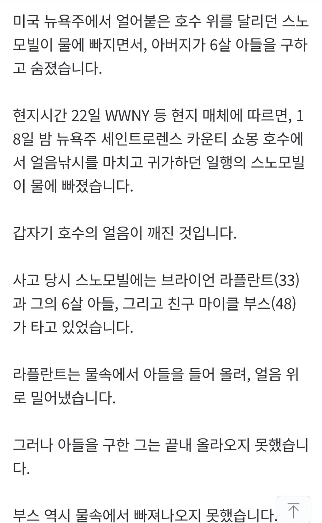 [여시뉴스데스크]"좋아, 할머니집 갈 수 있지?"…얼음 깨진 호수서 아들 구하고 숨진 미 아빠 작성자다이어때|작성시간26.01.23|조회수11,699 목록 댓글 18 글자크기 작게가 글자크기 크게가 출처: https://n.news.naver.com/article/422/00008259106살아이가 젖은채 아빠 구하겠다고 3km를....ㅜㅜ 다음검색 현재 게시글 추가 기능 열기 북마크 공유하기 신고 센터로 신고 댓글 댓글 18 댓글쓰기 답글쓰기 댓글 리스트 작성자토끼순경님 | 작성시간 26.01.23 애기 올리고 힘 빠지셨나보다 아이고 ㅜㅜㅜㅜㅜ... 작성자봄아봄아봄아 | 작성시간 26.01.23 3km...아가가 어떤맘으로..아빠랑 저 친구는또...아...너무 안타까운 사고다.. 작성자WOSWOSWOS | 작성시간 26.01.23 아이고 도움 요청하러 가는 길이 엄청 고되고 힘들었겠다...ㅠㅠㅠ 작성자안녕~개비! | 작성시간 26.01.23 아이고ㅜㅜㅜㅜㅜㅜ 작성자아아두잔째 | 작성시간 26.01.24 ㅠㅠㅠㅠㅇ너무 슬퍼 댓글 전체보기
