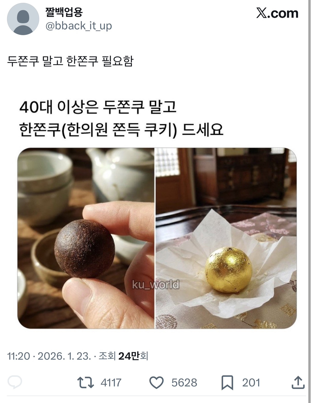 [흥미돋]40대 이상은 두쫀쿠 대신 한쫀쿠.twt 작성자따듯한공기|작성시간26.01.23|조회수75,573 목록 댓글 81 글자크기 작게가 글자크기 크게가 출처:https://x.com/bback_it_up/status/2014523698112499783?s=20 다음검색 현재 게시글 추가 기능 열기 북마크 공유하기 신고 센터로 신고 댓글 댓글 81 댓글쓰기 답글쓰기 댓글 리스트 작성자이안류 | 작성시간 26.01.23 쟤는 0이 하나 더 있잖아요ㅋㅋㅋㅋㅋ 작성자팥콩쿙 | 작성시간 26.01.23 저기요ㅛㅋㅋㅋㅋㅋㅋㅋㅋㅋ 작성자법은 나중이야 싯팔 그냥 | 작성시간 26.01.24 몇배는 비싸잖아요ㅠ 작성자세탁소 | 작성시간 26.01.24 그건 진짜 너무 비싸잖아요.. 작성자모델 김현중 | 작성시간 26.01.24 한알에 8만원 댓글 전체보기