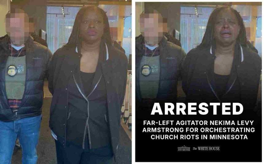 네키마 레비 암스트롱이 체포될 당시 모습이 포착된 사진. 처음 공개된 사진(왼쪽) 속 암스트롱의 모습은 백악관이 공개한 사진(오른쪽)에서는 달라져 있다./X(옛 트위터)
