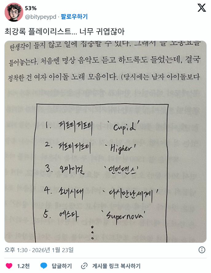 [흥미돋]최강록 플레이리스트 작성자두쫀쿠케이크|작성시간26.01.23|조회수24,149 목록 댓글 16 글자크기 작게가 글자크기 크게가 출처: https://theqoo.net/square/4071160661 역시 맛잘알 다음검색 현재 게시글 추가 기능 열기 북마크 공유하기 신고 센터로 신고 댓글 댓글 16 댓글쓰기 답글쓰기 댓글 리스트 작성자뱃살주물럭 | 작성시간 26.01.23 와 케이팝 망령이었네 작성자가다니가나지 | 작성시간 26.01.23 들을 줄 아는 놈이군 작성자이불김밥 | 작성시간 26.01.23 어떻게 리듬을 안타지...? 작성자히소카 | 작성시간 26.01.23 하이어 진짜 개조은데 ㅋㅋㅋㅋㅋㅋㅋ 작성자고양이발바닥바닥 | 작성시간 26.01.23 아 갸웃겨ㅠㅠㅠ 댓글 전체보기
