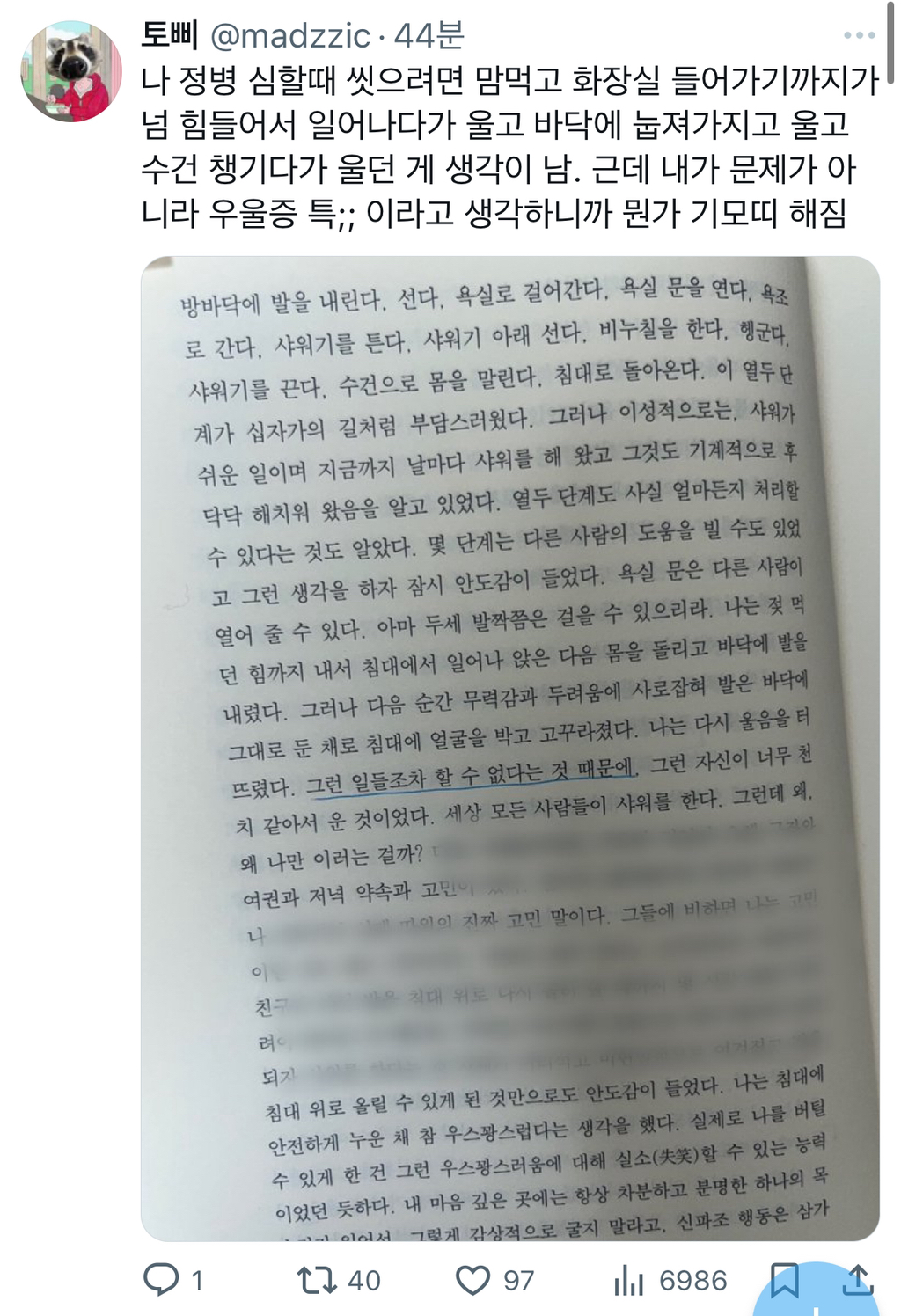 작성자만쥬는먹어도슈붕은못참아 작성시간 26.01.23 씻으려고 침대에서 몸 일으켰다가 다시 힘없이 눕고 간신히 일어났다가 다시 쓰러지듯이 눕고 이거 반복하다가 결국 샤워 못하고 이런 날들의 반복임