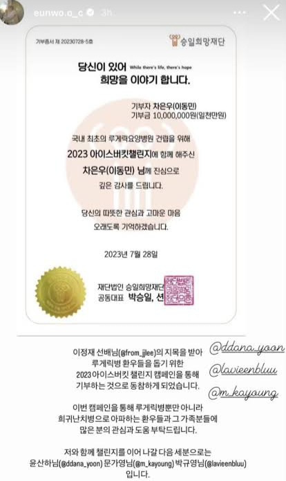 (유닉스전자 이충구 회장이 차은우를 모델로 선정하여 일부 모델료를 공동기부 하기로 합의) 공동기부 1000만원
