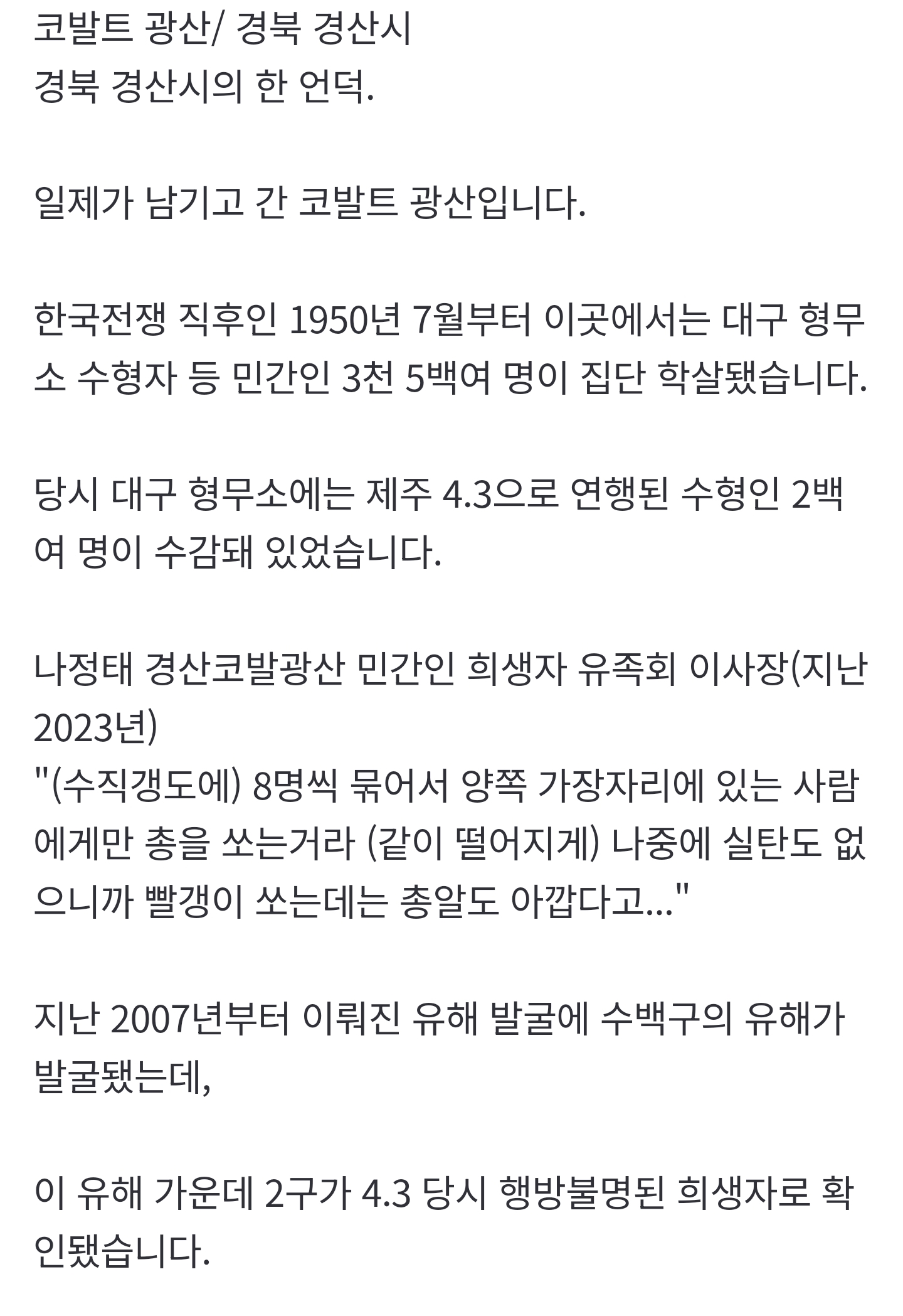 [여시뉴스데스크][자막뉴스] 비극의 코발트 광산...4.3 희생자 신원 첫 확인 작성자10to4소취|작성시간26.01.23|조회수4,944 목록 댓글 12 글자크기 작게가 글자크기 크게가 출처: https://n.news.naver.com/article/661/0000069833?sid=102[자막뉴스] 비극의 코발트 광산...4.3 희생자 신원 첫 확인코발트 광산/ 경북 경산시 경북 경산시의 한 언덕. 일제가 남기고 간 코발트 광산입니다. 한국전쟁 직후인 1950년 7월부터 이곳에서는 대구 형무소 수형자 등 민간인 3천 5백여 명이 집단 학살됐습n.news.naver.com전문 출처이승만 부관참시 했으면.. 다음검색 현재 게시글 추가 기능 열기 북마크 공유하기 신고 센터로 신고 댓글 댓글 12 댓글쓰기 답글쓰기 댓글 리스트 작성자또또리 | 작성시간 26.01.23 세상에... 제주에서.. 작성자김주택 | 작성시간 26.01.23 한강 작가님의 작별하지 않는다 생각난다... 답댓글 작성자파도도 | 작성시간 26.01.23 나도.. 너무 슬프네 작성자GEGURI | 작성시간 26.01.23 아 진짜 끔찍하다.... 오늘도 일혐 충전 완 작성자개저담금주 | 작성시간 26.01.23 이승만 너무 곱게 뒤짐 지금도 망령 달고 다니는 인간들 많아서 징그러운데 댓글 전체보기