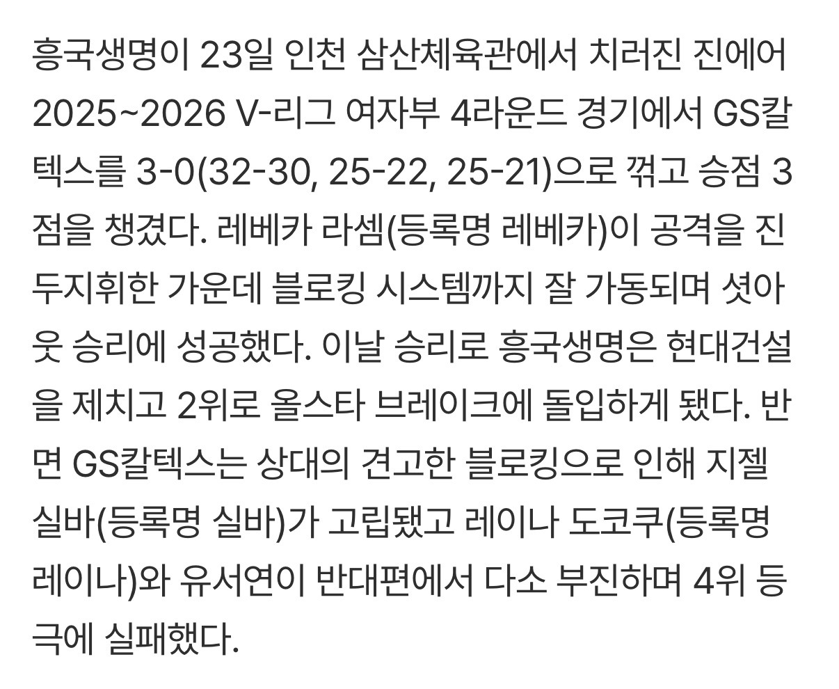 [여시뉴스데스크]브레이크 고장 났다! 5연승 흥국생명, GS칼텍스 잡고 2위로 점프…이제 1위 한국도로공사 추격한다 [MD인천] 작성자슈퍼펭귄시리얼|작성시간26.01.23|조회수1,759 목록 댓글 3 글자크기 작게가 글자크기 크게가 출처: https://m.sports.naver.com/volleyball/article/117/0004029132브레이크 고장 났다! 5연승 흥국생명, GS칼텍스 잡고 2위로 점프…이제 1위 한국도로공사 추격한여기를 눌러 링크를 확인하세요m.sports.naver.com 다음검색 현재 게시글 추가 기능 열기 북마크 공유하기 신고 센터로 신고 댓글 댓글 3 댓글쓰기 답글쓰기 댓글 리스트 작성자이킁에킁 | 작성시간 26.01.23 요시하라 미쳤다... 12셋보고 존잼경기 예상했는데 떼잉... 흥국2위 ㅊㅋㅊㅋ 실바ㅜㅜ 힘내여ㅜㅜ 작성자성골여시 | 작성시간 26.01.23 현건.. 진짜.. 작성자갑자기야 | 작성시간 26.01.23 우와 댓글 전체보기