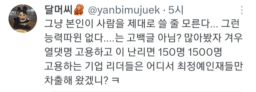 작성자ㅇㅈ?ㅇㅈㅇㅈ 작성시간 26.01.24 최저시급 수준 인력쓰면서 바라는것도 많다 ㅉㅉ 연봉 한 5000씩 줘가면서 사람 구해봐라