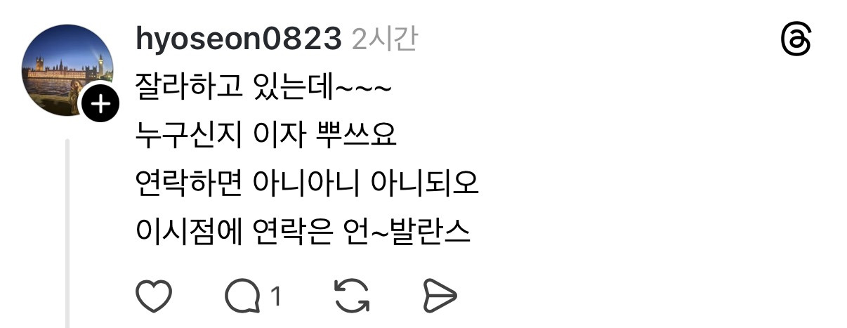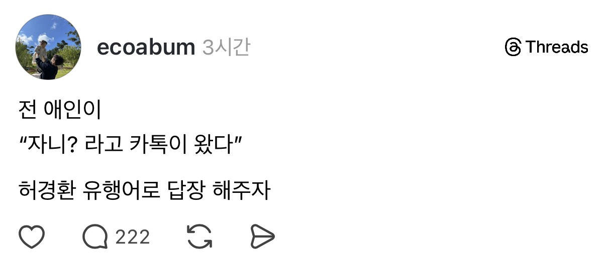 [배꼽의행방]전 애인이 “자니?” 라고 연락왔을때 허경환 유행어로 답장해보자 작성자죽덕후|작성시간26.01.23|조회수80,356 목록 댓글 47 글자크기 작게가 글자크기 크게가 출처: https://www.threads.com/@ecoabum/post/DT2Z4gjj_jA?xmt=AQF0nRPR_YF-kN5xfnUtirnyJx_vDDrXJ1JpLFGF-Y0M23PggWI_3IdYgZ-fFBMZRygdeCJh&slof=1ㅋㅋㅋㅋㅋㅋㅋㅋㅋ문제시 삭제 다음검색 현재 게시글 추가 기능 열기 북마크 공유하기 신고 센터로 신고 댓글 댓글 47 댓글쓰기 답글쓰기 댓글 리스트 작성자쥐뿌라기 | 작성시간 26.01.24 자니자니자식아 작성자도재학 | 작성시간 26.01.24 난 지금 잘라하고 있는데~ 있는데~🎤 작성자이게또되네 | 작성시간 26.01.24 불안하네 작성자김엘사핑 | 작성시간 26.01.24 아니아니아니자요~~~~~~~~ 작성자The Next Big Thing | 작성시간 26.01.24 하존아웃곀ㅋㅋㅋㅋㅋㅋㅋㅋㅋㅋㅋㅋㅋㅋㅋㅋ 댓글 전체보기