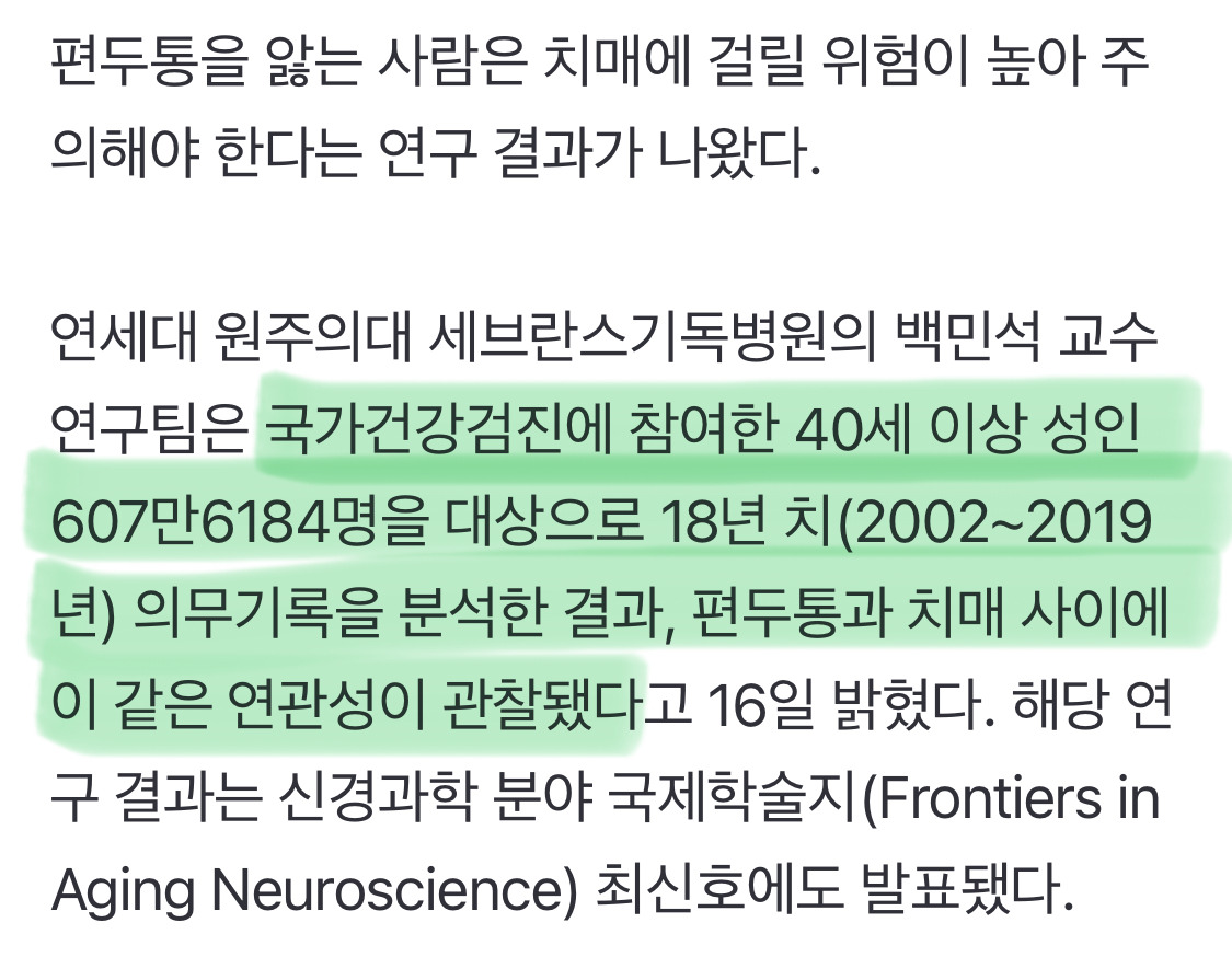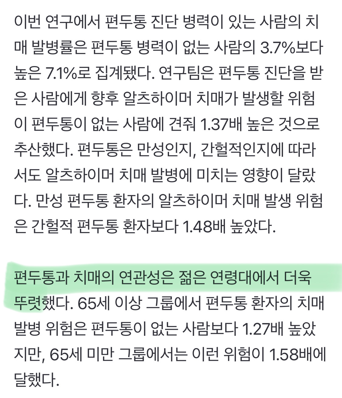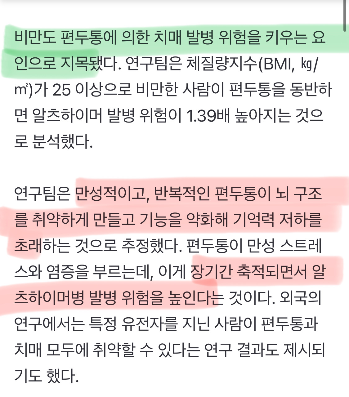 [기타]편두통을 앓거나 비만인 사람은 치매 걸릴 확률이 더 높다 작성자(본인닉네임).|작성시간26.01.23|조회수8,759 목록 댓글 36 글자크기 작게가 글자크기 크게가 출처: https://n.news.naver.com/article/021/0002577450?sid=102 다음검색 현재 게시글 추가 기능 열기 북마크 공유하기 신고 센터로 신고 댓글 댓글 36 댓글쓰기 답글쓰기 댓글 리스트 작성자개적폐육아시간없애라고 | 작성시간 26.01.24 헐 미친....편두통만 해도 빡쳐 죽겠는데ㅠㅠㅠ 작성자스윗글로브 | 작성시간 26.01.24 나 둘다야ㅠㅠㅠ하 작성자kid아이 | 작성시간 26.01.24 ㅠ ㅠ 어릴때부터 평생 편두통인데요 ㅠ ㅠ 작성자사회성 없는걸 mbti로 포장하지 마세 | 작성시간 26.01.24 근돼는요ㅠ..? 작성자허몽블랙티 | 작성시간 26.01.29 금방 죽겠네 댓글 전체보기