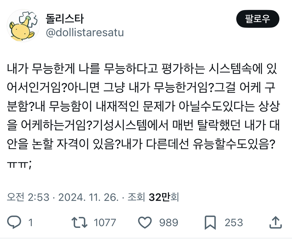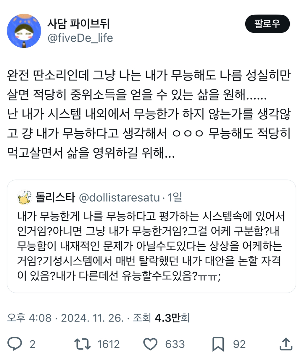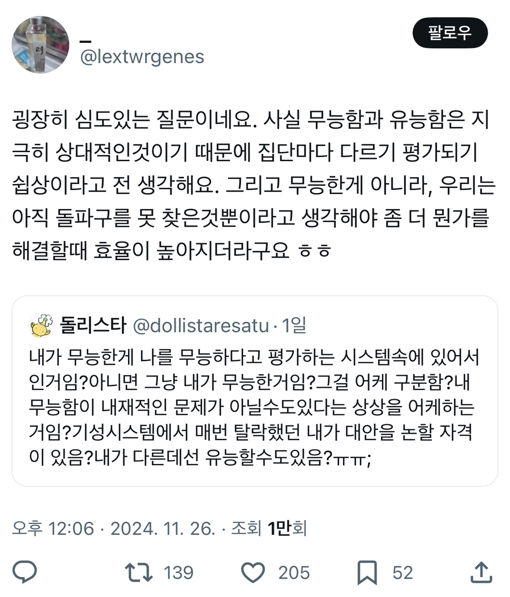 작성자그런갑지걍 작성시간 26.01.24 사람마다 특출난 재능, 스탯 분포가 다른데 사회가 요구하는건 그중 일부만이니까 부합하지 않으면 무능력자로 평가되는거지뭐
