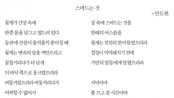 [스크랩] [흥미돋]'간장게장 시' 읽고 우는 아이돌 영상을 본 안도현 시인의 소감.jpg 작성자암낫큣|작성시간26.01.23|조회수47,296 목록 댓글 66 글자크기 작게가 글자크기 크게가 출처: https://youtube.com/shorts/QoGNmoc6xhI?si=veUMlIWsVRWzH3Wo +재재가 그때 왜 울었냐고 물어봄 간장게장 시 읽고 우는 영상 다음검색 스크랩 원문 : *여성시대* 차분한 20대들의 알흠다운 공간 현재 게시글 추가 기능 열기 북마크 공유하기 신고 센터로 신고 댓글 댓글 66 댓글쓰기 답글쓰기 댓글 리스트 작성자라리루라리 | 작성시간 26.01.24 개슬프자나 작성자실링팬 | 작성시간 26.01.24 나 울컥할때마다 날아라슈퍼보드에 나온 악당게 생각함 부적 이마에붙인거 작성자앙버터크림치즈 | 작성시간 26.01.24 나 겁나 울컥했었는데...역시 가짜 모성애라 그런가...갑자기 짜치네 작성자첫만남은 섬광처럼 | 작성시간 26.01.24 어우 나도 고등학생때 이 시 처음봤을때 눈물 찔끔했음 너무슬퍼요 작성자gogetit | 작성시간 26.02.21 개슬퍼 진짜... 댓글 전체보기