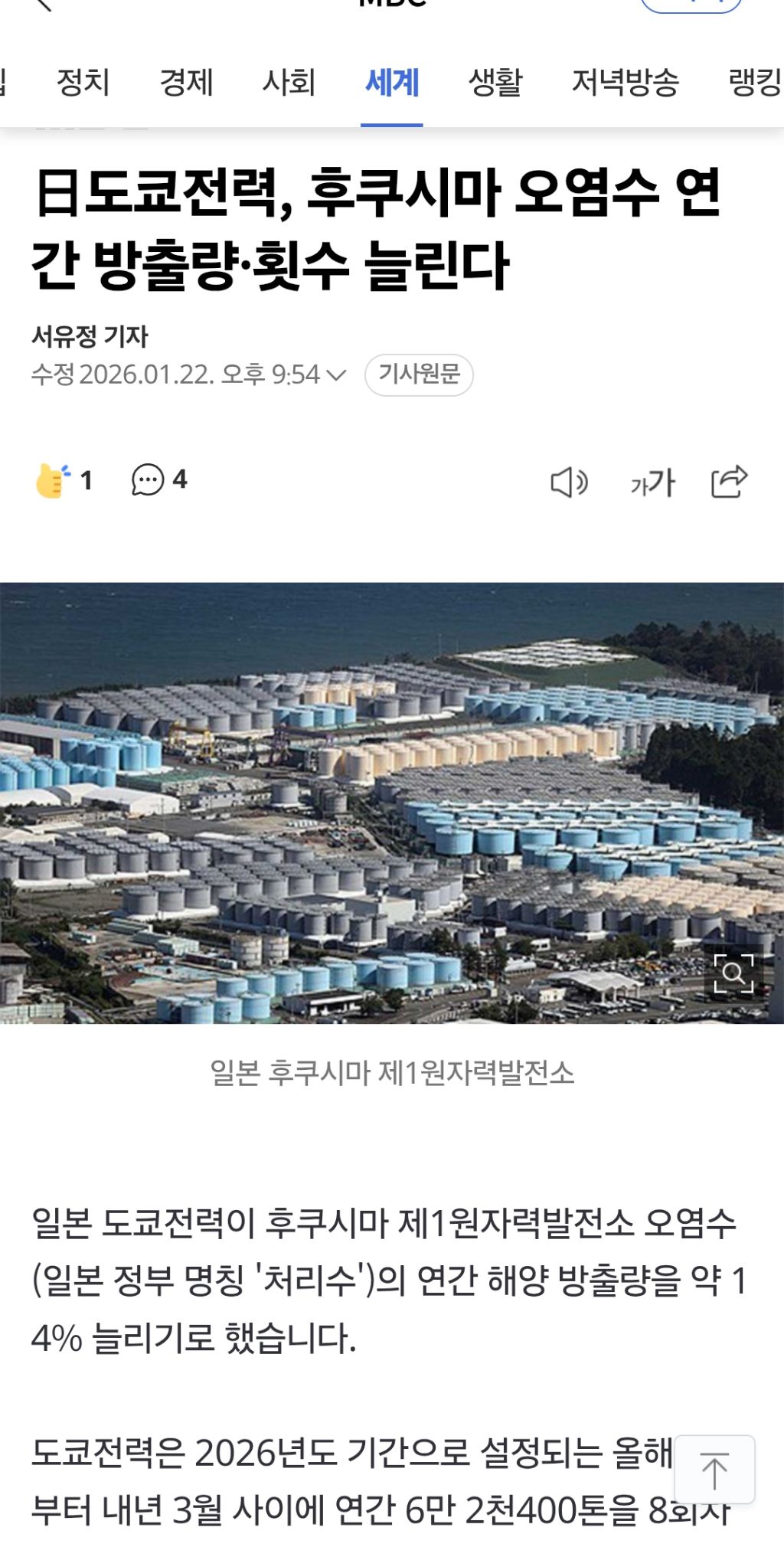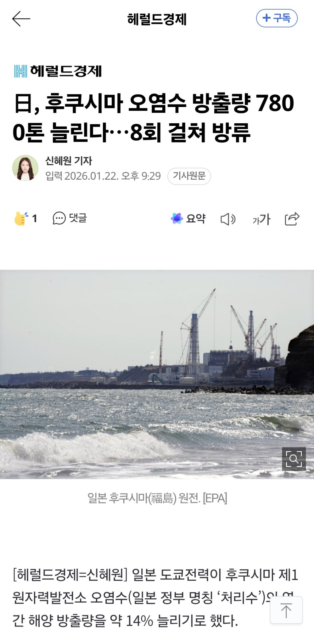 [여시뉴스데스크]日, 올해 후쿠시마 오염수 방출량 7800톤 늘린다…8회 걸쳐 방류 작성자정동남|작성시간26.01.24|조회수2,665 목록 댓글 17 글자크기 작게가 글자크기 크게가 출처: https://naver.me/x2cvrjUD日, 후쿠시마 오염수 방출량 7800톤 늘린다…8회 걸쳐 방류일본 후쿠시마(福島) 원전. [EPA] 일본 도쿄전력이 후쿠시마 제1원자력발전소 오염수(일본 정부 명칭 ‘처리수’)의 연간 해양 방출량을 약 14% 늘리기로 했다. 도쿄전력은 2026년도(2026년 4월∼2027n.news.naver.comhttps://naver.me/xhlGUlN3日도쿄전력, 후쿠시마 오염수 연간 방출량·횟수 늘린다일본 도쿄전력이 후쿠시마 제1원자력발전소 오염수(일본 정부 명칭 '처리수')의 연간 해양 방출량을 약 14% 늘리기로 했습니다. 도쿄전력은 2026년도 기간으로 설정되는 올해 4월부터 내년 3월 사n.news.naver.com 다음검색 현재 게시글 추가 기능 열기 북마크 공유하기 신고 센터로 신고 댓글 댓글 17 댓글쓰기 답글쓰기 댓글 리스트 작성자내마음에사과 | 작성시간 26.01.24 왜 걍 끼고살지ㅜ 작성자이킁에킁 | 작성시간 26.01.24 지구 혼자 쓰냐고ㅗ 작성자모모@ | 작성시간 26.01.24 죽어 미친놈들아 작성자화내봤자실속없다 | 작성시간 26.01.24 ㅁㅊ색히들 작성자아바라주이소 | 작성시간 26.01.24 십할 댓글 전체보기