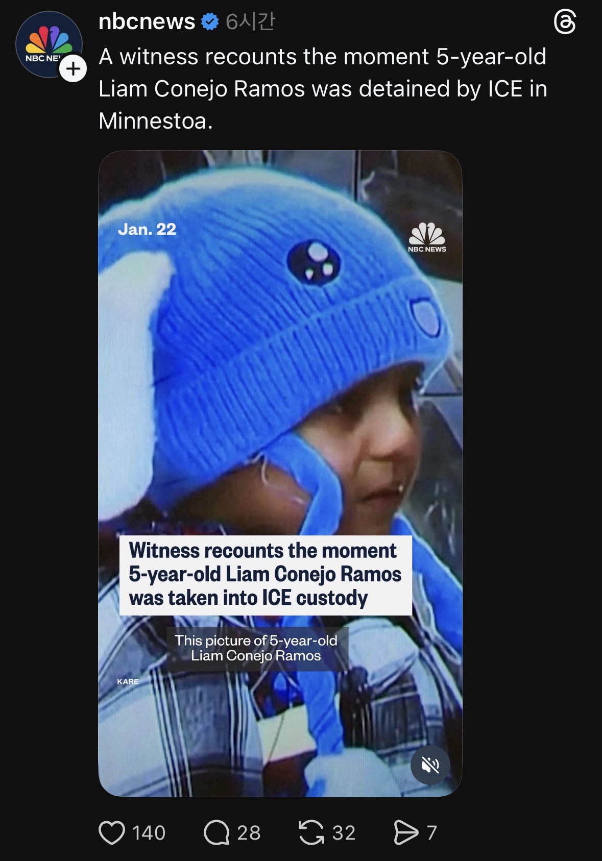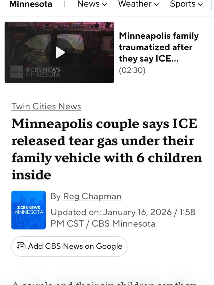 최근 미니애폴리스에서 ICE는 후추 스프레이 곰 스프레이 등을 얼굴에 직접 쏘고 있는데 6명의 아이들이 함께 탄 차를 향에 쏨