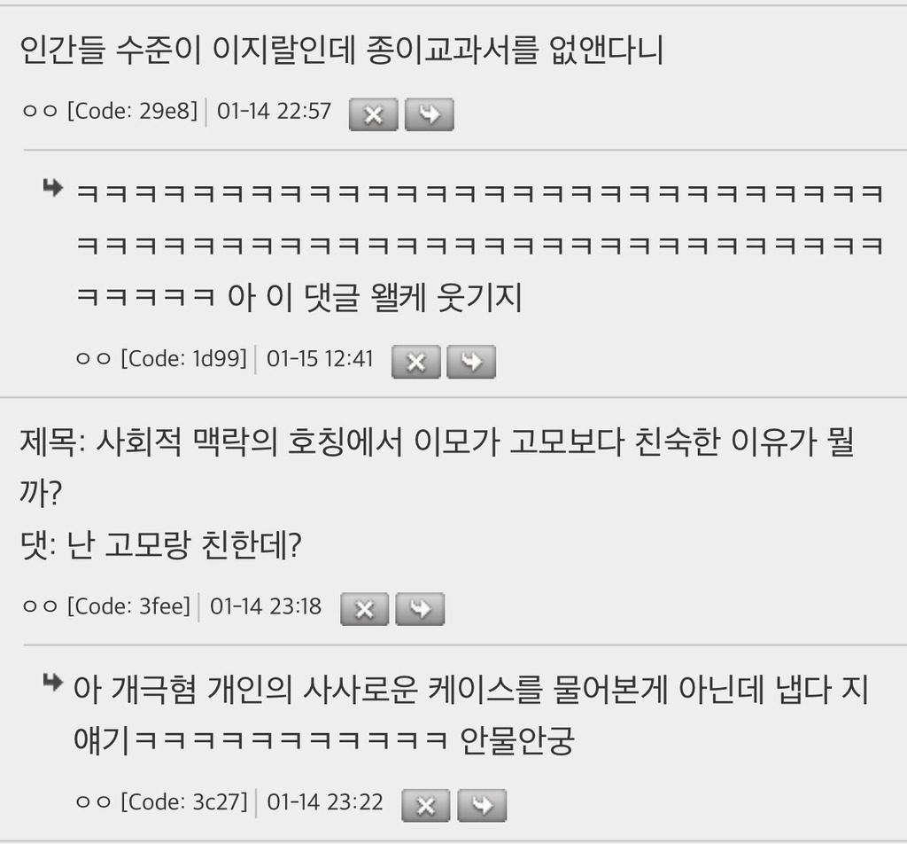 작성자귀인상봉나에게로 작성시간 26.01.25 요즘 진짜 전체적으로 사람들 지능이낮아진거같아.. 하..