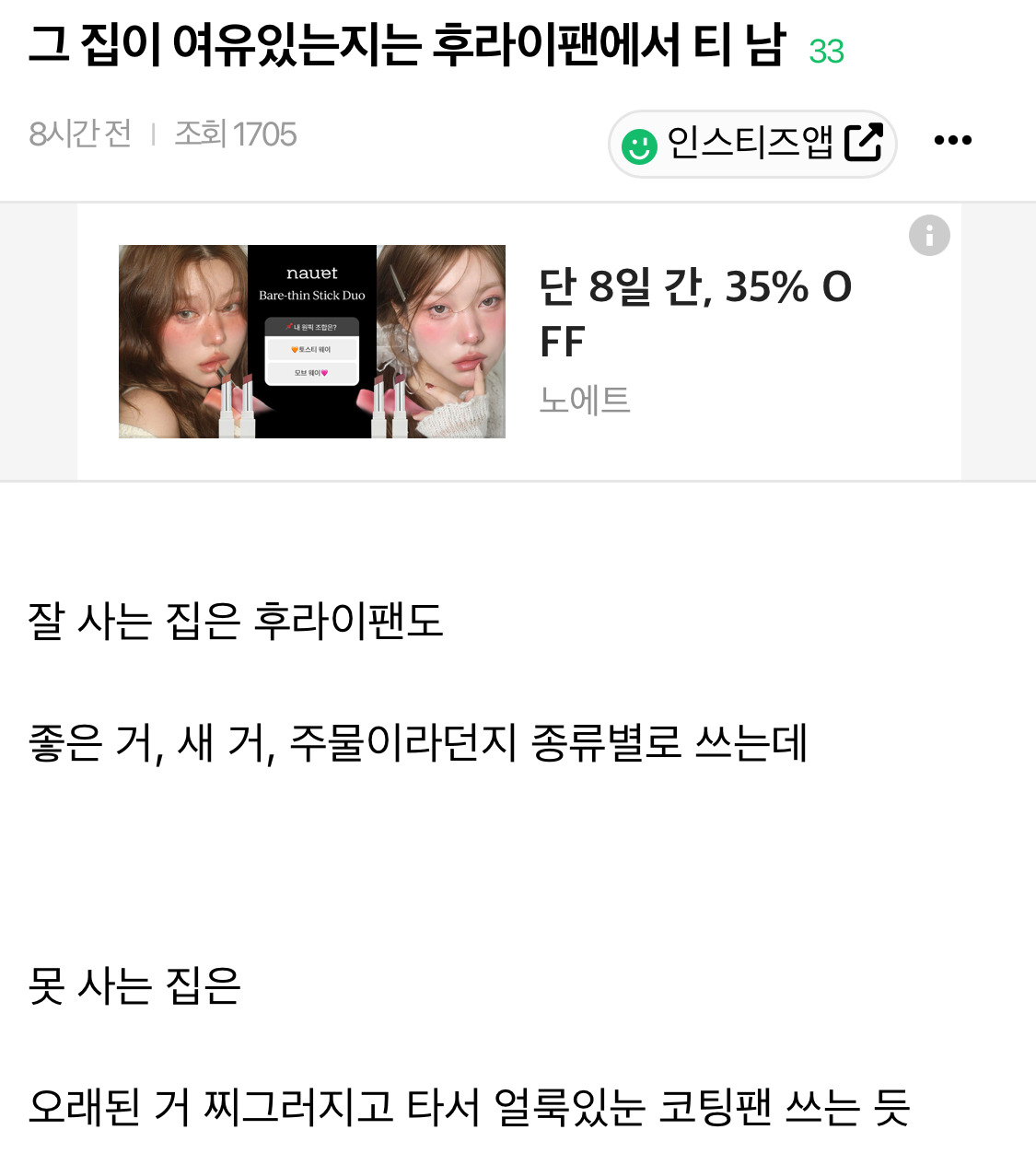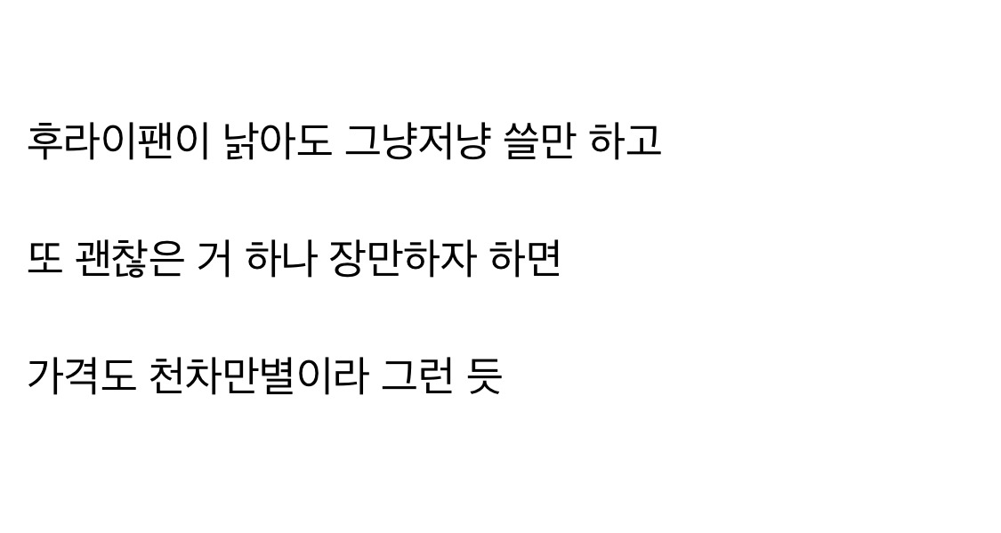 작성자아뽀키 작성시간 26.01.26 뭐 저렇게 따지면 식기 다 따지고 평수도 따지고...뭐 인테리어만 봐도 알겠는데 굳이 후라이팬 가지고..?