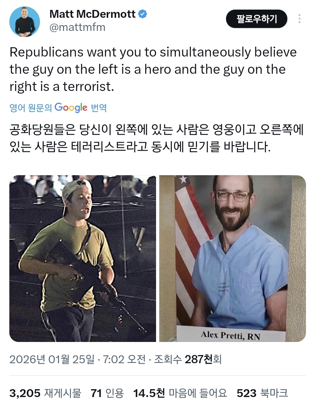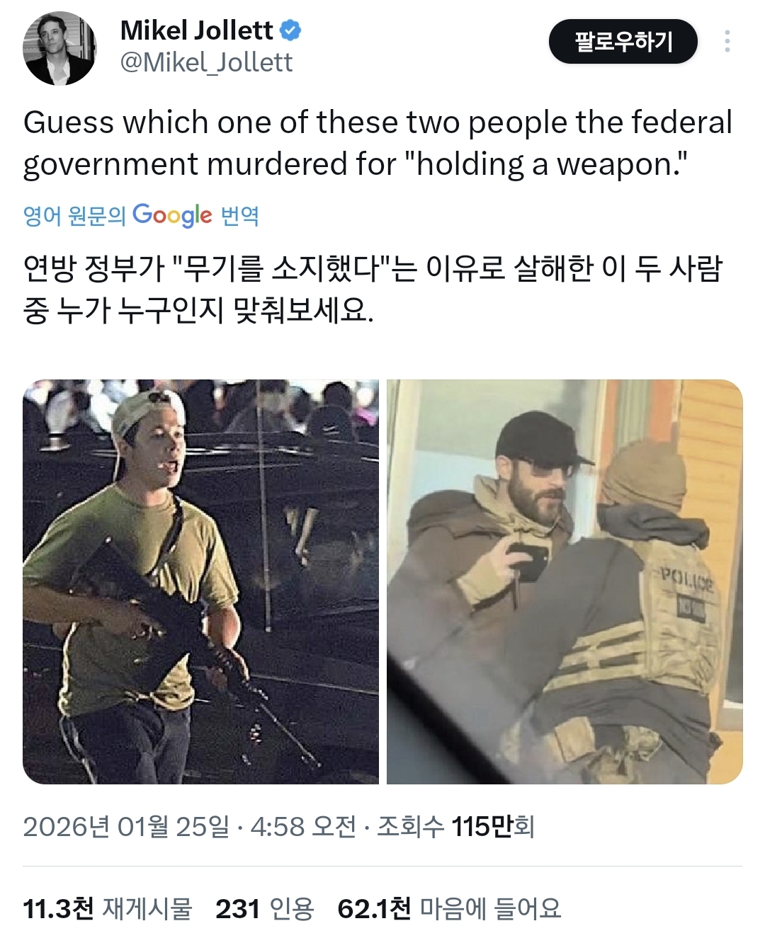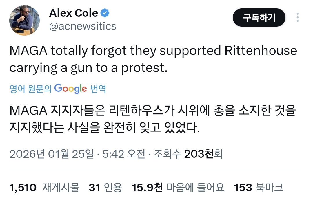 극우들 이때는 얘 보고 환호했음 총기를 소지하고 사람을 쏴죽였는데도