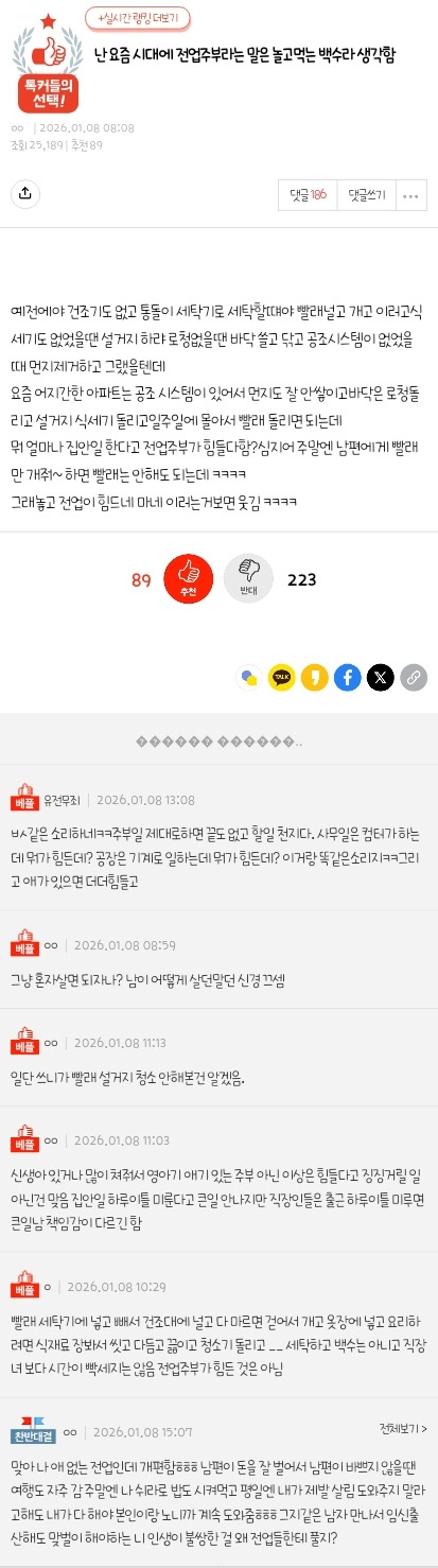 [흥미돋]난 요즘 시대에 전업주부라는 말은 놀도먹는 백수라 생각함 작성자햄터구름|작성시간26.01.25|조회수32,211 목록 댓글 170 글자크기 작게가 글자크기 크게가 출처: https://m.pann.nate.com/talk/375145824?order=B 다음검색 현재 게시글 추가 기능 열기 북마크 공유하기 신고 센터로 신고 댓글 댓글 170 댓글쓰기 답글쓰기 댓글 리스트 작성자10:40 | 작성시간 26.01.26 애 크면 개꿀 맞음 작성자갈사람은가야지 | 작성시간 26.01.26 캥거루때 취준하면서 집안일 다했는데..백수였고요. . 작성자초록메롱바바 | 작성시간 26.01.26 살아있으면 자동으로 해야하는 게 집안일인데..그걸 직업으로 칠 순 없지 작성자건조기를 살것이다 | 작성시간 26.01.26 난 혼자 살아도 일도하고 집안일도 하고 다 하는뎅 작성자죈이 | 작성시간 26.01.26 근데..애 없는 전업은 ㄹㅇ 개꿀 아니냐..ㅋㅋㅋㅋㅋ 댓글 전체보기