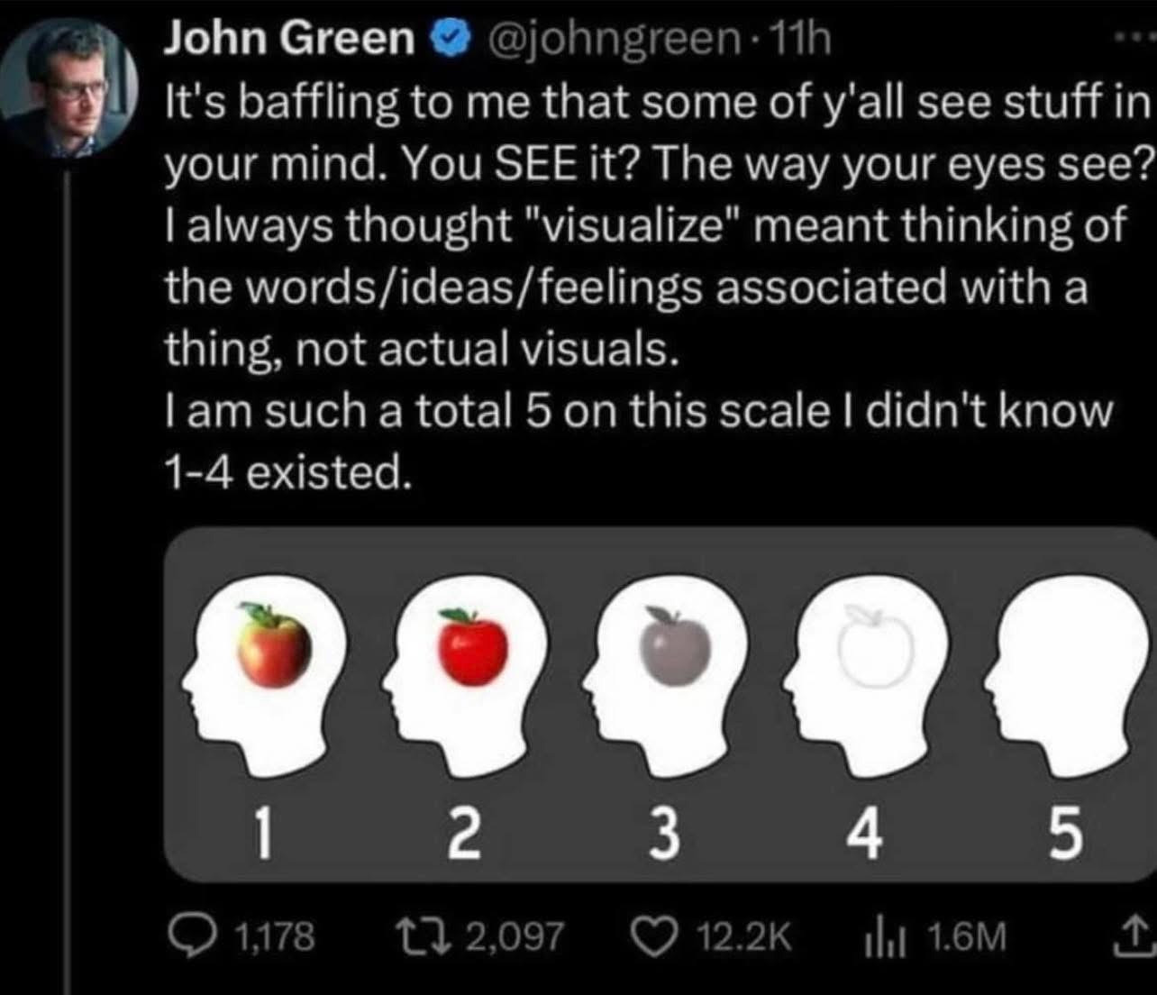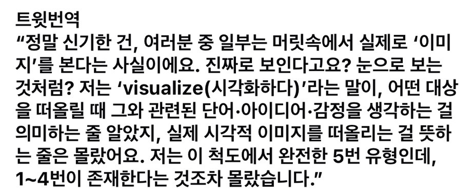 꿈도 관련 있는진 모르겠는데 난 실제랑 구분 못할 정도로 꿈 꿈. 근데 흑백 꿈만 꾸는 사람도 있다는 글 보고 놀란 적이 있어. 난 꿈에서 깰 때 와 다행이다 존나마니함 ㅋㅋㅋㅋㅋㅋㅋ 구분이 안될정도라.. 그리고 난 느낌도 다 나던데 ㅜ 왜 꼬집으면 안아프다는건지...... 암튼 .. 소설볼때도 완전 다 상상하는데 위에 활자만 본다해서 너무 신기하다..... 난 상상하는건 무조건 시각화인데 .... 지금 개미를 상상해도 더듬이 눈알 표정까지 다 시각화 가능한디 -