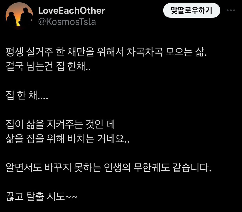 작성자회무지좋아하는사람 작성시간 26.01.25 주거안정을 추구하는건 인간의 본능... 지방에 10년된 아파트 하나 사면서 화장실 리모델링 하고 보일러 교체하고 도배 장판만 했는데도 살기 정말 좋아.. 집을 사기 전에 느낄수없었던 묘한 안정감과 평안이 생김... 그저 내 몸뚱이 하나 뉘일만한 내 집이 있다는 것 자체가...