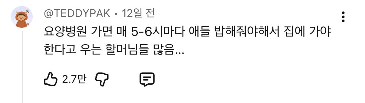 [눈물한방울]모두를 오열하게한 알람소리 작성자별그지같은데서온그대|작성시간26.01.26|조회수104,178 목록 댓글 17 글자크기 작게가 글자크기 크게가 출처: 여성시대 별그지같은데서온그대https://youtube.com/shorts/LgW8WP6p5es?si=srl6QlYVAvY2RFPG(전체화면으로 보세요)ㅠㅠㅠㅠㅠ 다음검색 현재 게시글 추가 기능 열기 북마크 공유하기 신고 센터로 신고 댓글 댓글 17 댓글쓰기 답글쓰기 댓글 리스트 작성자주식으로2억먹는다 | 작성시간 26.01.26 아나미친 ... 눈물 ㅠㅠ 작성자천국보다낯선 | 작성시간 26.01.26 아나ㅠㅜㅠㅠ울리지마세요 작성자토토로로 | 작성시간 26.01.26 에휴 ㅠㅠㅠㅠㅠㅠㅠㅠ 치매 제발.. 작성자뻐물리 | 작성시간 26.01.27 아... 하ㅠㅠㅜ 작성자일확천금원해 | 작성시간 26.02.03 ㅠㅠㅠㅠㅠㅠㅠ다니는 병원 치매 할머니들 생각나서 눈물나ㅜㅜㅜ 댓글 전체보기