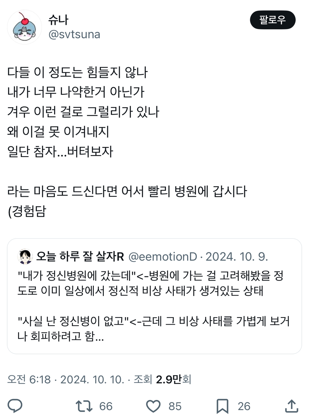 작성자한로로뽀로로 작성시간 26.01.26 그냥 가봐 병원 여러곳 가봤는데 뇌파 찍어보더니 오히려 스트레스에 회복능력이 높다고 그렇게 말해주니까 어? 그런가? 싶고 우울할것도 안우울해지고 그랬음